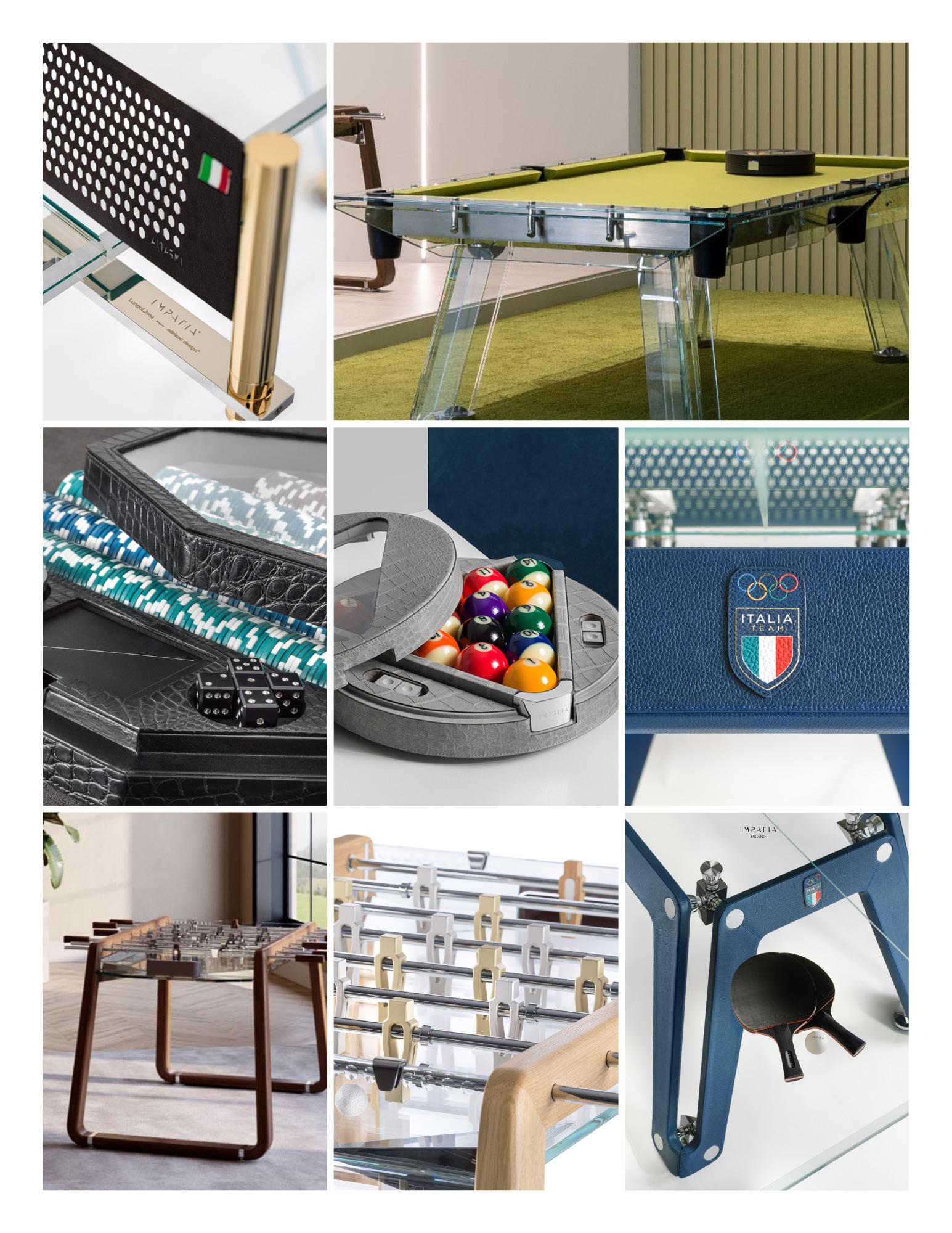 Impatia merges Italian craftsmanship with innovative design to create luxury game tables and play sets that are as much about aesthetics as they are about the game. The brand reimagines traditional games like billiards, pingpong, and poker by blending modern materials such as glass, metal, and leather.