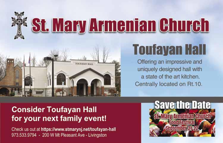 St. Mary’s Annual Food Festival will take place on Saturday and Sunday September 21 and 22. Attendees can look forward to delicious Armenian cuisine, live music, fun children’s activities, amazing vendors, and a 50/50 raffle. Saturday will feature a special segment of live Armenian music. The festival serves as the church’s secondlargest fundraiser.