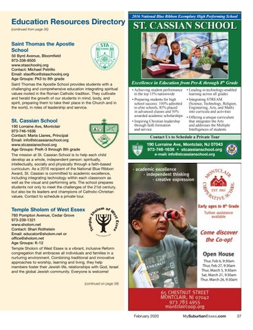 St. Cassian School 190 Lorraine Ave, Montclair 973-746-1636 Contact: Maria Llanes, Principal Email: info@stcassianschool.org www.stcassianschool.org Age Groups: PreK-3 through 8th grade The mission at St. Cassian School is to help each child develop as a whole, independent person: spiritually, intellectually, socially and physically through a faith-based curriculum. As a 2016 recipient of the National Blue Ribbon Award, St. Cassian is committed to academic excellence, including integrating technology within each classroom as well as the visual and performing arts. The school prepares students not only to meet the challenges of the 21st century, but also be its leaders and champions of Catholic-Christian values. Contact to schedule a private tour.