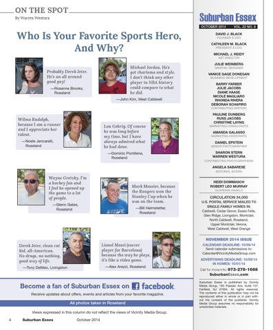 Suburban Essex is published by Vicinity Media Group, 165 Passaic Ave, Suite 107, Fairfield, NJ 07004. All rights reserved. The contents of this publication may not be reproduced either in whole or in part without the consent of the publisher. Vicinity Media Group assumes no responsibility for unsolicited materials.