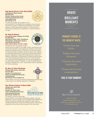 St. Rose of Lima Academy 52 Short Hills Avenue, Short Hills 973-379-3973 Contact: Tina Underwood Email: principal@srlacademy.org srlacademy.org Age Groups: Pre-K; Grades 3–8 A faith based community of learners changing the world through a clear vision of our Catholic approach to education.
