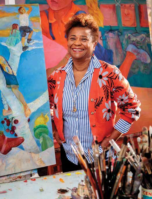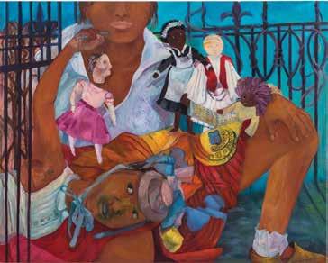 Autobiography is again visible in The Gathering, a 60x48 inch oil on linen painting completed in 2021. Is one of the children here Williamson? Maybe. But most definitely the dolls and marionette included are representative of her personal collection of dolls and toys. She shares with us that her parents worked as domestics, hence, we see a maid, and traditional Greek doll because the family who employed them was of Greek origin. Notice also a traditional African doll as well. The dolls are safely nestled in the arms of the child, just as children need a safe place to gather. The iron fence behind the children makes us wonder if the kids are safe within a space… or kept outside of it. We think Williamson wants us to decide.