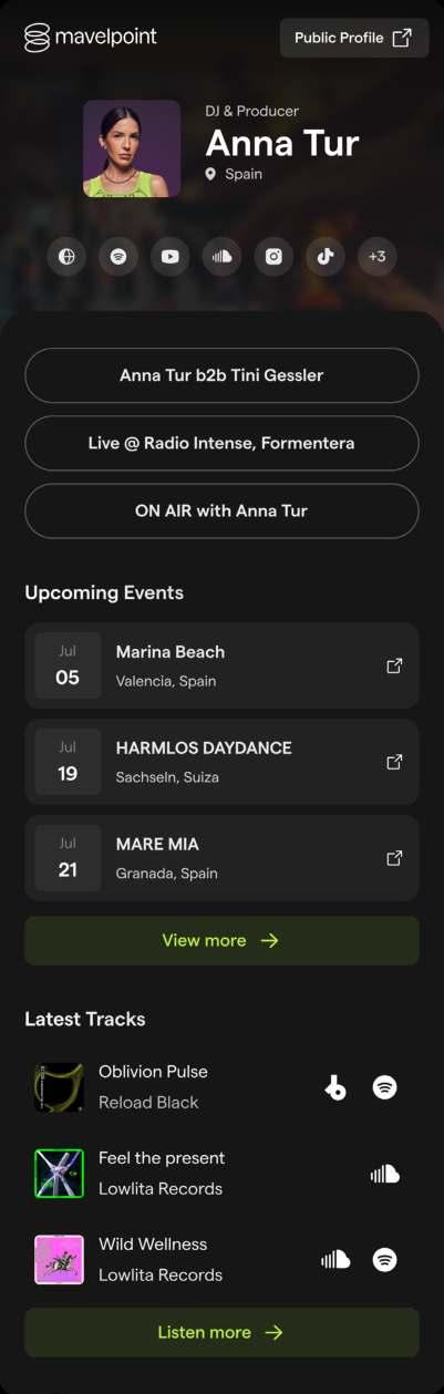 Formada a golpe de cabina y evolución constante, su estilo se define por una cuidada selección musical, mezclas fluidas y una capacidad innata para leer atmósferas. Ha convertido el arte del DJing en una experiencia inmersiva que se adapta tanto a clubs underground como a escenarios de gran formato. Festivales como Malva Soul Live, espacios como Pikes Ibiza, Teatro Eslava o Momento Marbella, e incluso citas internacionales como Latin Grammy Week ya han sido testigos de su energía sonora.