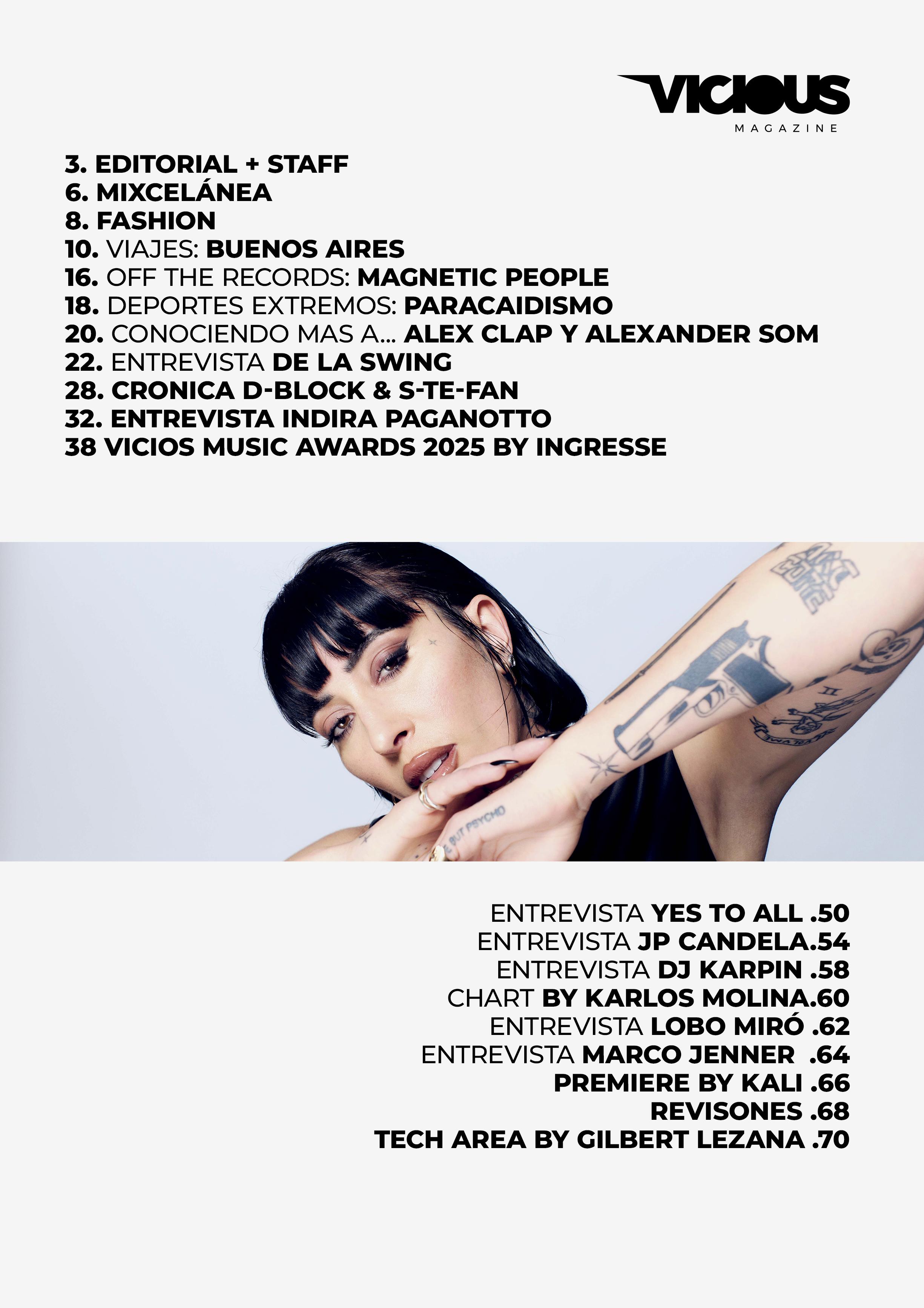 Esta edición también es un viaje humano. Conocemos más de cerca a Alex Clap y Alexander Som, exploramos historias personales, procesos y visiones que construyen la escena. Las entrevistas se suceden como sesiones intensas: De la Swing, Yes To All, JP Candela, DJ Karpin, Lobo Miro, Marco Jenner e Indira Paganotto, ya como mejor artista nacional en los Vicious Awards 2025.