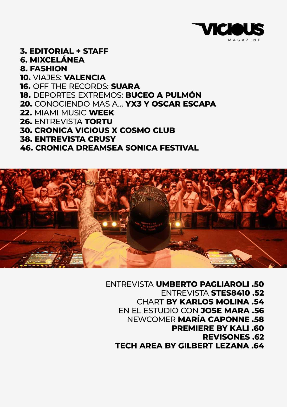 Completan la edición las entrevistas con Tortu y Umberto Pagliaroli, las crónicas Vicious x Cosmos y Dreamsea Sonica, el Chart Vicious by Karlos Molina, En el Estudio con Jose de Mara, Premiere by Kaly, nuestras revisiones musicales y Tech Area by Gilbert Lezana.