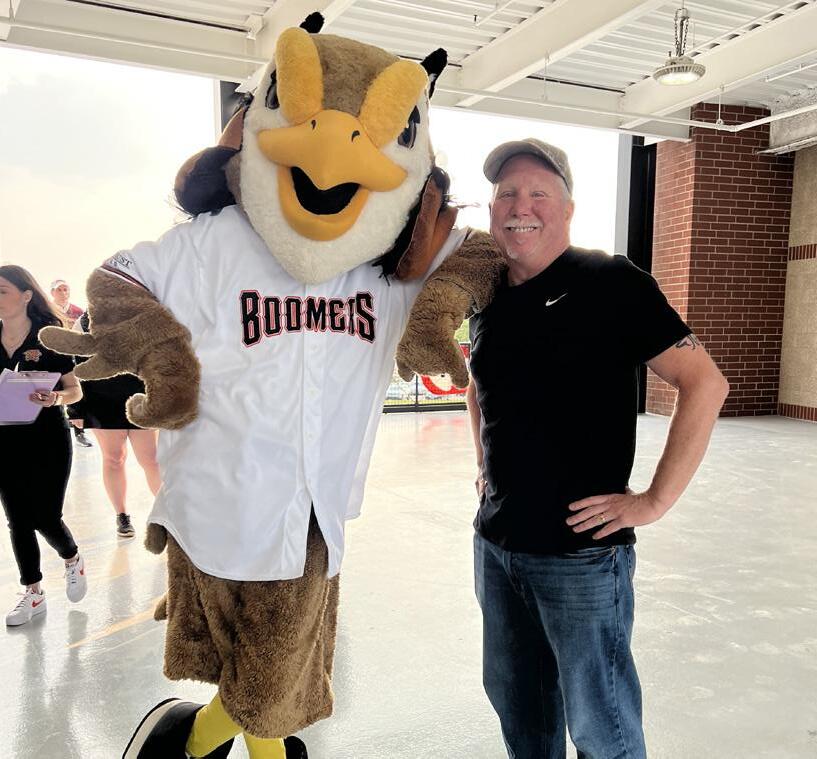 Kevin Chmura with the Schaumburg Boomers mascot.