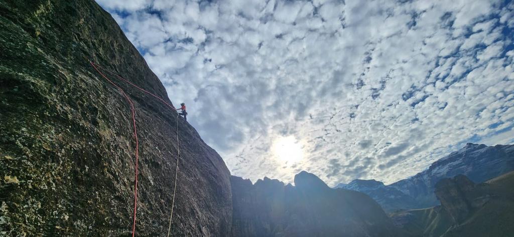 The Monk’s first pitch, an infamous offwidth crack in a corner, is well known as a challenge. The nervous excitement surged as we sorted gear and set off towards the Sleeping Beauty Cave under a radiant blue sky, against a backdrop of a shimmering, snowdraped escarpment.