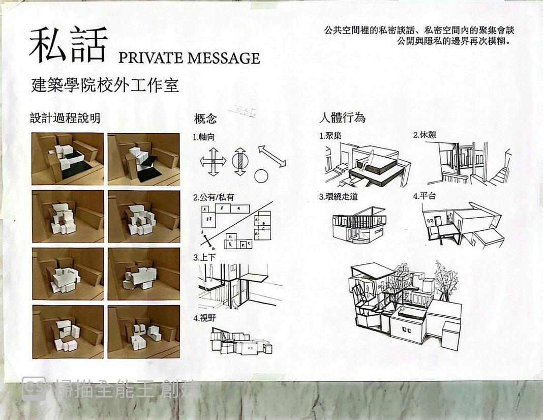 以軸線上下去區分範圍,以深淺來切割領域 公共空間的私密談話,私密空間的聚集會談 又再次將邊界模糊。