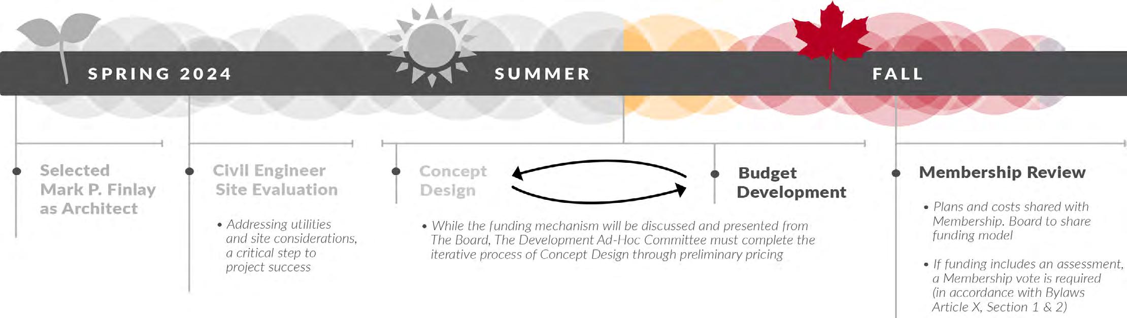 L ooking ahead, our Development Ad-Hoc Committee, Board, and Executive Committee are diligently preparing to present the proposed project for the Club. We are thrilled to share the fruits of their labor with you soon. In the meantime, I encourage you to continue following their progress through the upcoming installment in the series on infrastructure (see page 4 for more details). Your engagement remains crucial as we move forward with these exciting developments.