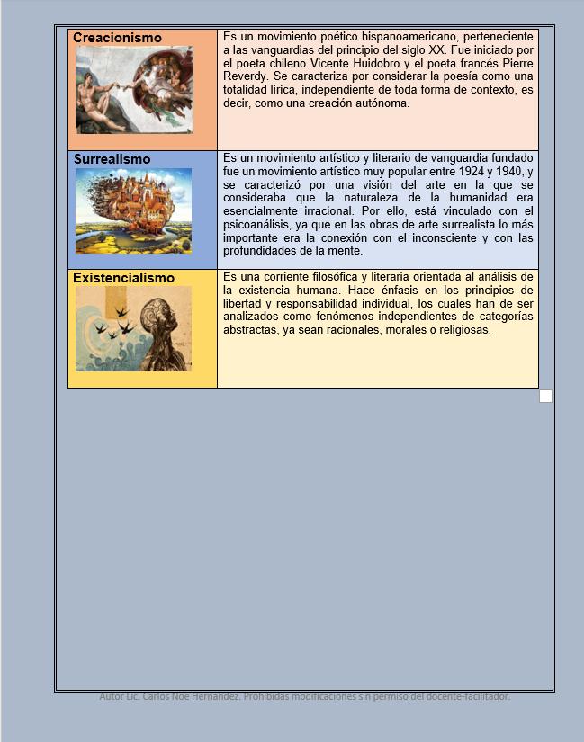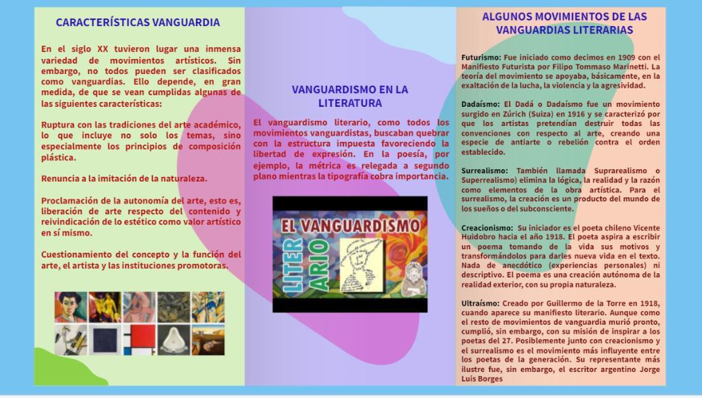 El VANGUARDISMO es una de las corrientes más actuales y que a partir de ella se generan tres más que son el surrealismo, el dadaísmo y el existencialismo, aparecidas en las primeras épocas del siglo XX.