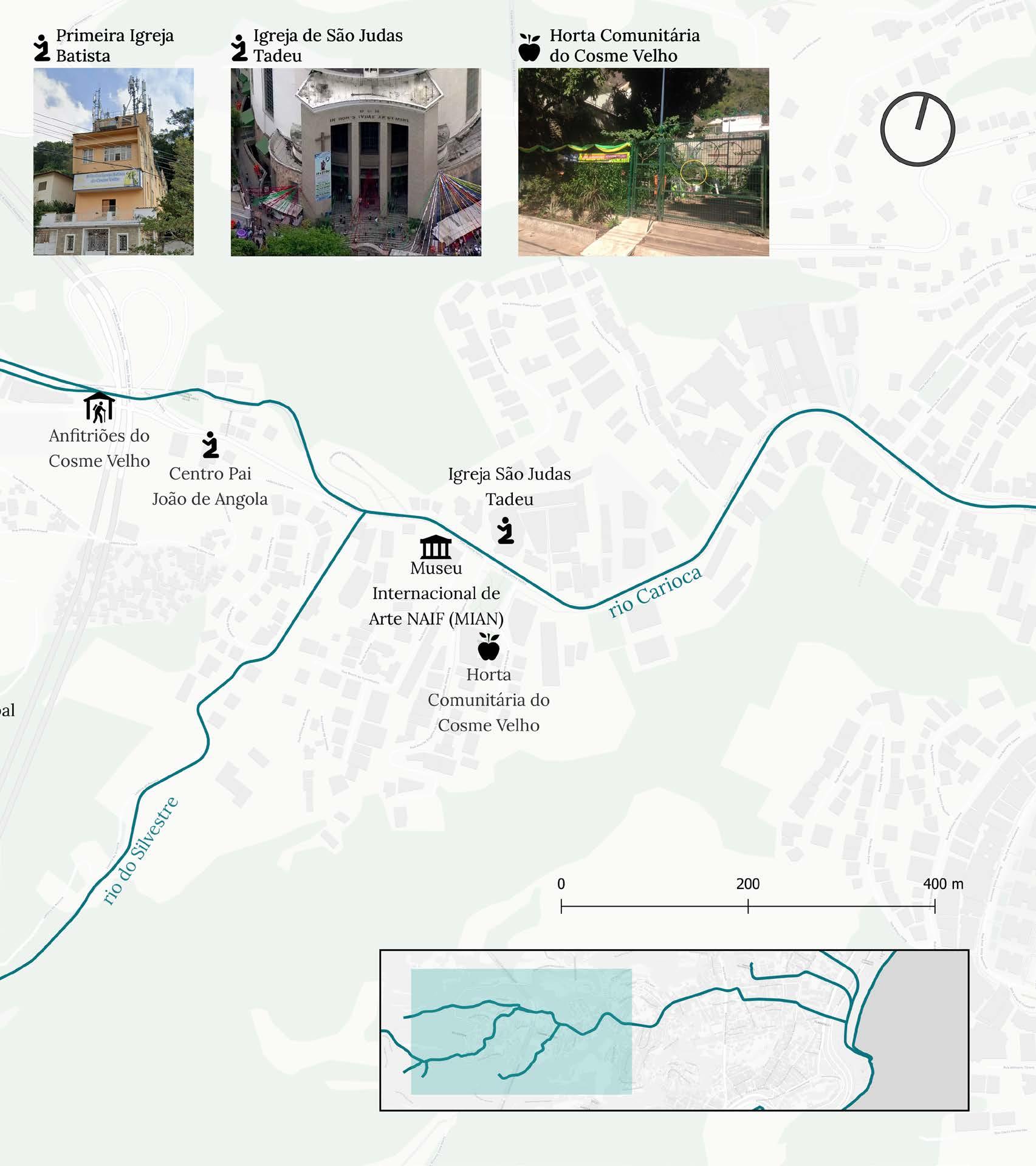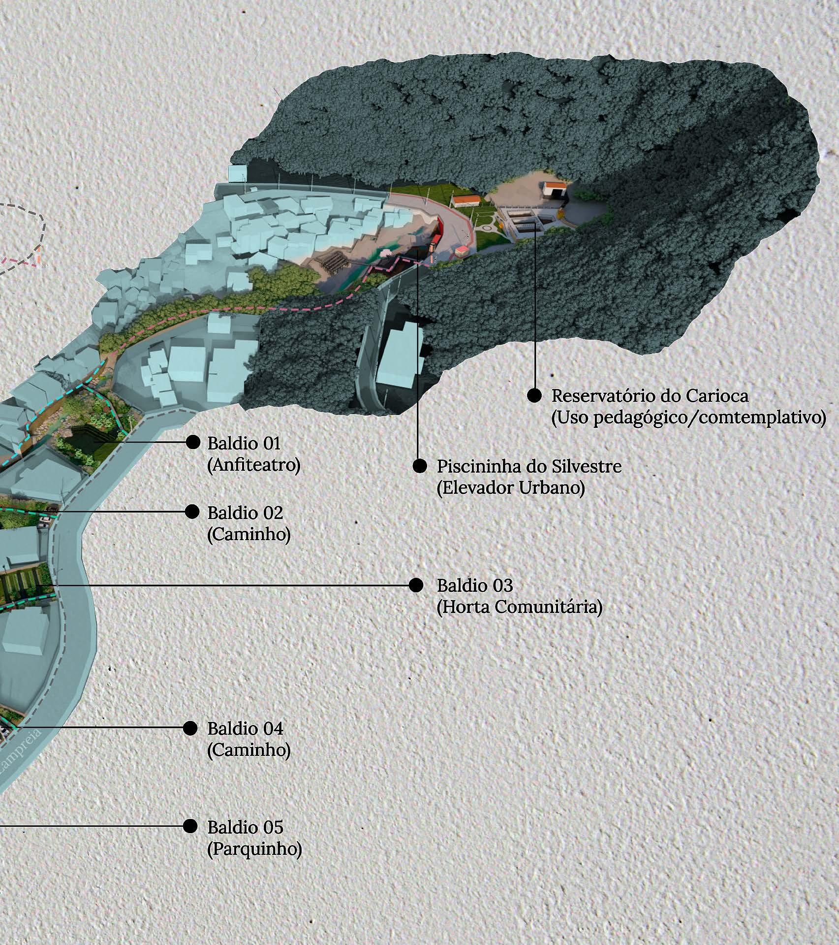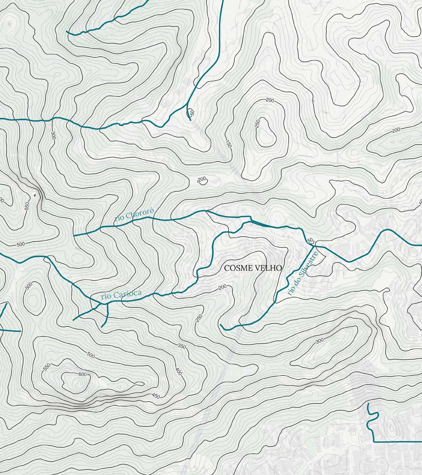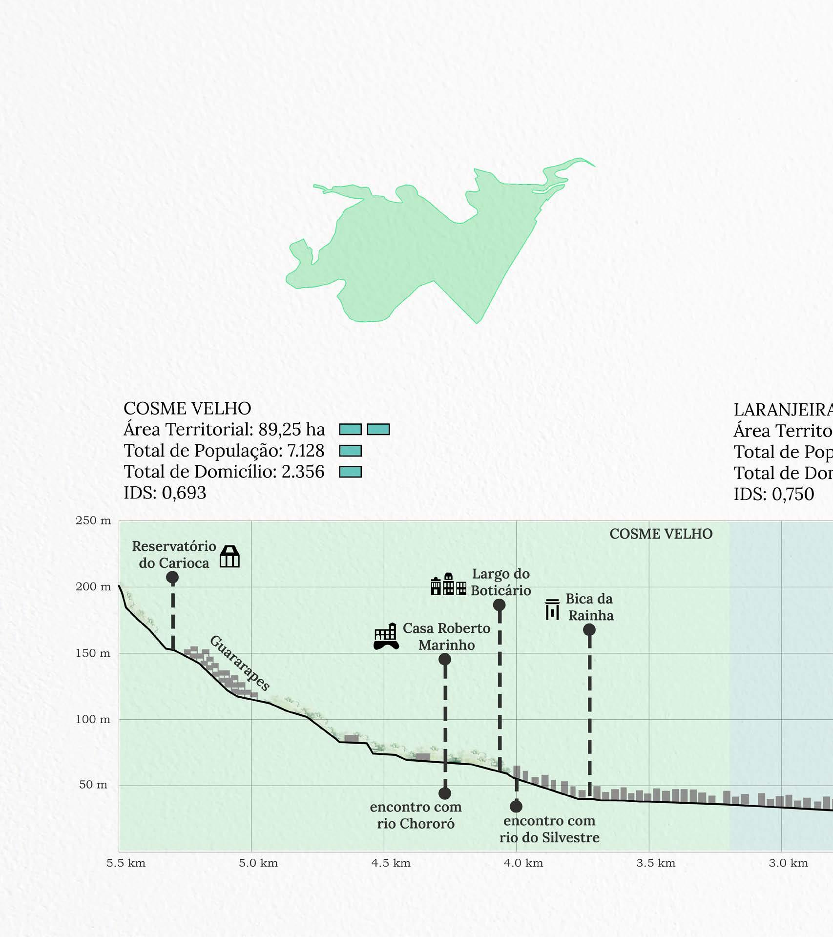 The relationship between society and the Carioca River in the city of Rio de Janeiro left behind historical vestiges in the form of reservoirs, auxiliary facilities, public faucets, pools, ditches, and ruins. These heritages, closely connected with the expansion of Rio de Janeiro between the 18th and 19th centuries, find themselves dispersed along the Cosme Velho district and totally disjointed from the urban tissue. Nevertheless, the local community and visitants continue to make use of these installations for leisure and contemplation. Therefore, what can be perceived is a two-sided problem that can be de fined by the binomial oblivion-disconnection.