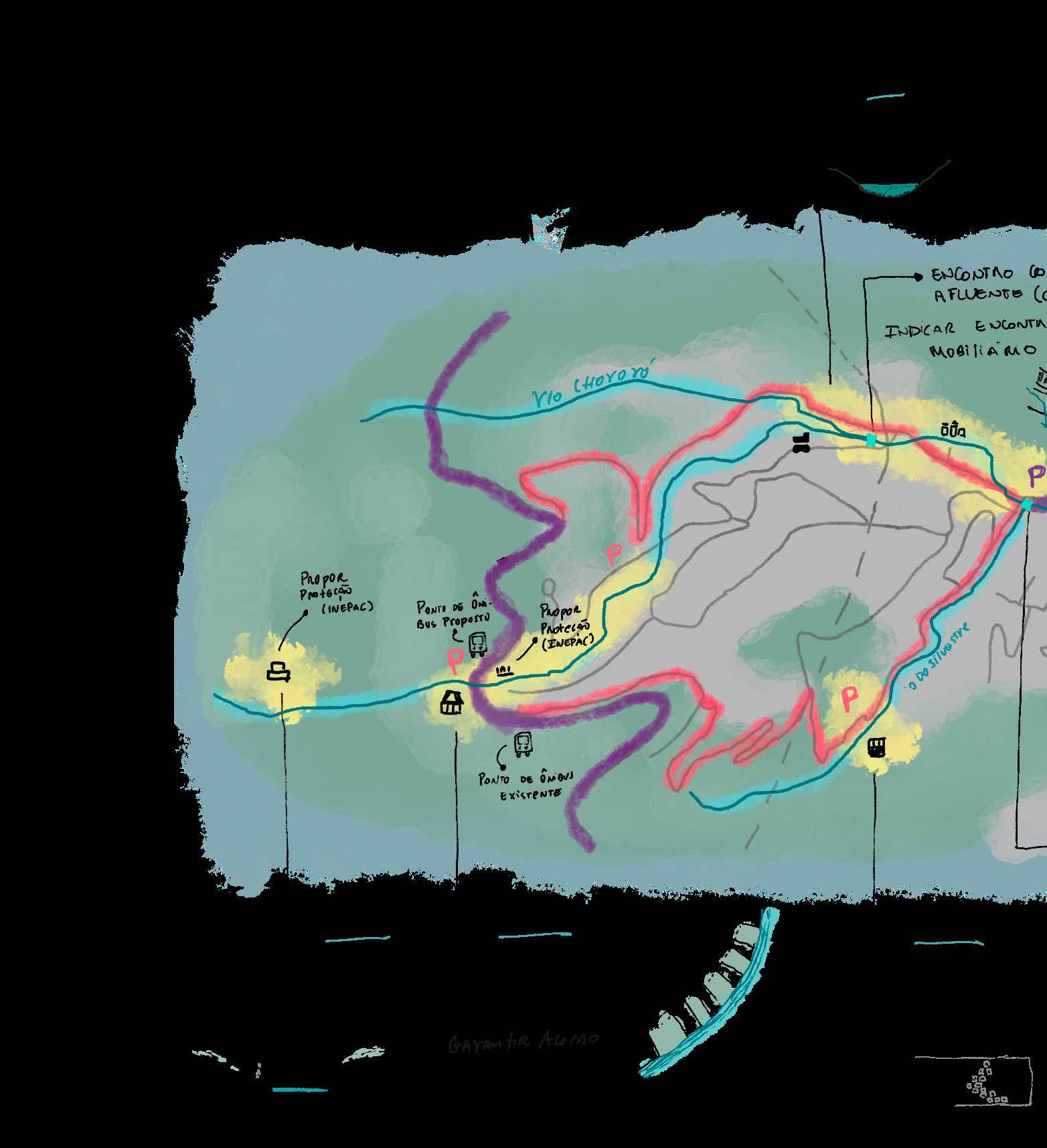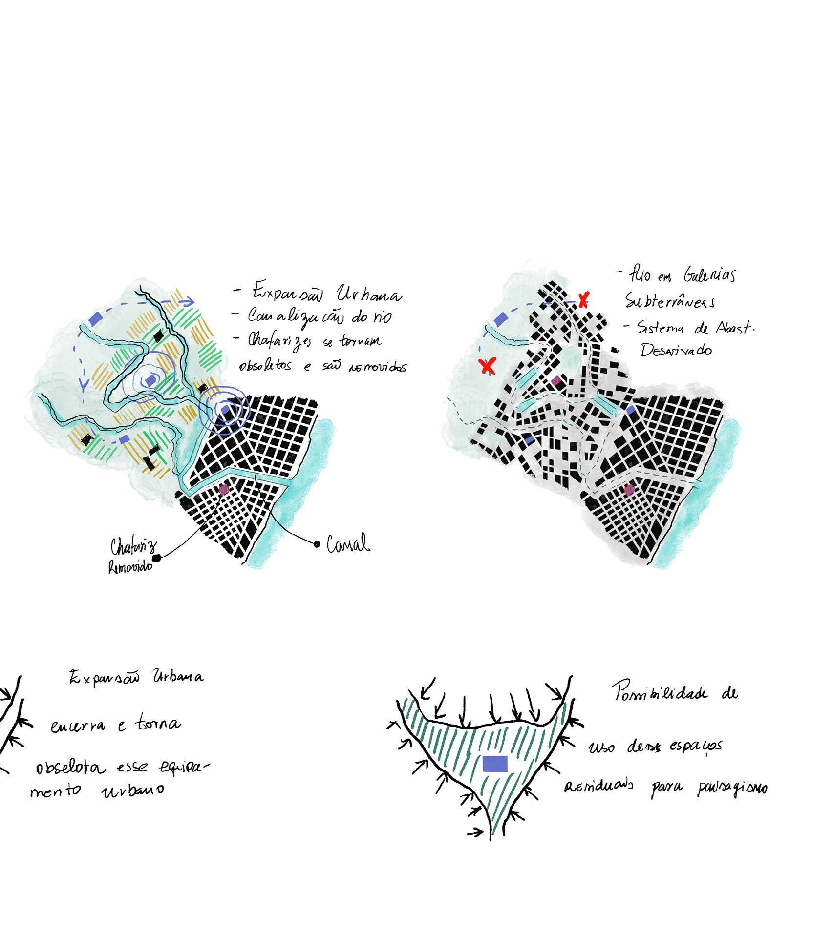 Por conseguinte, trata-se de um projeto de conclusão de curso que visa intervir nessas preexistências para gerar espaços públicos que valorizem a memória vinculada a esses vestígios da interação entre o rio e a sociedade, colocando-as em evidência no meio urbano, permitindo novas formas de trânsito por elas e desenvolvendo usos para esses espaços a partir da observação das dinâmicas que já acontecem ali.
