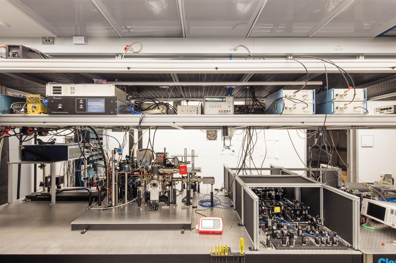Physics Lab - Controlsandmagnetsthatneedaccesstopower, data, airandotherutilities acrossthebenchtop.aceiling-mountedracewayprovidecontinuousaccessandallowfor benchshelvingtoliftupanddownwithoutrestriction.