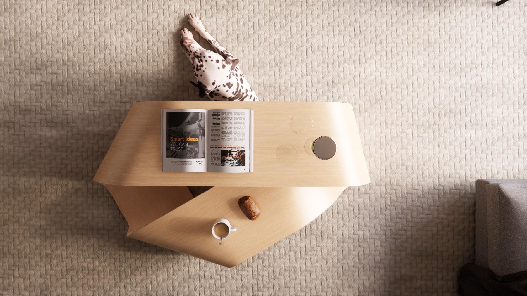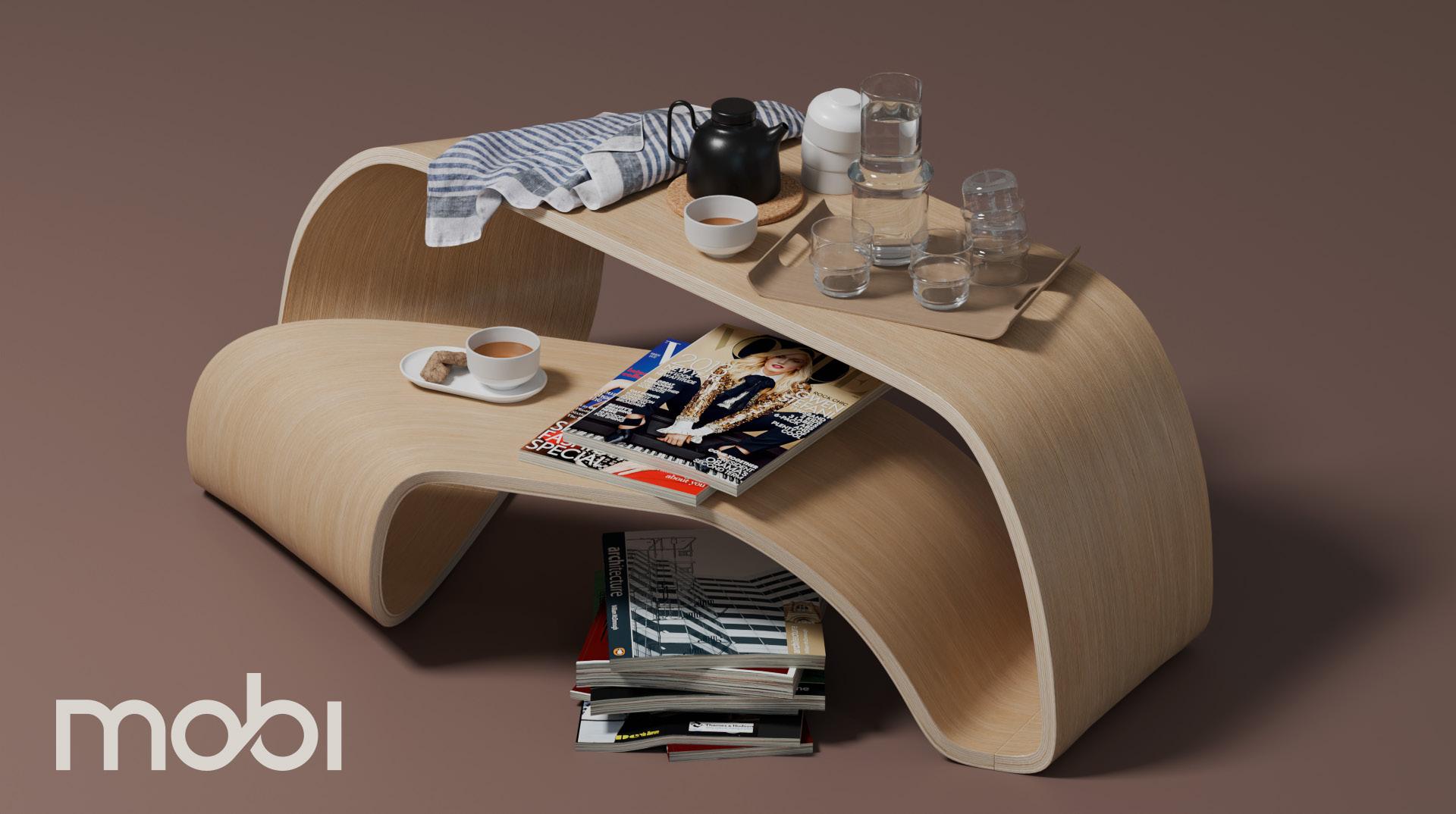 Mobi is a coffee table made of two strips of bent plywood, joined together where they meet the floor to form a single continuous ribbon. It was obviously inspired by the Möbius strip, the famous non-orientable surface that in its extreme simplicity defies conventional Euclidean geometry and embodies the idea of transformation through space.