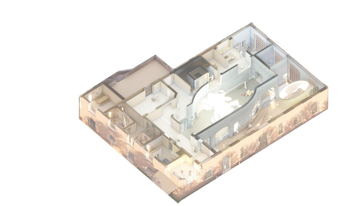 My inspiration came from Frank Gehry’s “fluid” architecture inspired by fish, and more particularly his fish lamps as featured artworks. To architecturaly accompany Gehry’s emotionally rich design language inspired by the movement of fish, I designed an interior waterscape of light using a custom glass-brick facade to capture the element of water from both within and without as connecting element inviting curiosity through translucence between the private exhibition space, and connected public outdoor piazza.