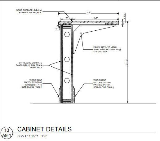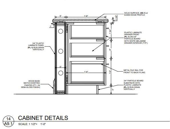 J:\170.55.00 Gwinnett 500 Building\170.55.05 Women’s Specialists of Northside Gwinnett\1. Production\4. Construction Documents\170.55.05 Womens Specialists CD Set_.pln R 2 A3.50 3 A3.50 4 A3.50 10 A6.10 11 A6.10 7 A6.10 6 A6.10 9 A6.10 24 A6.11 5 A6.10 12 A6.10 16 A6.10 13 A6.10 14 A6.10 15 A6.10 2 A6.10 18 A6.11 19 A6.11 20 A6.11 1 A6.10 5 A6.10 5 A6.10 5 A6.10 5 A6.10 5 A6.10 5 A6.10 5 A6.10 5 A6.10 5 A6.10 5 A6.10 5 A6.10 5 A6.10 5 A6.10 5 A6.10 21 A6.11 25 A6.11 22 A6.11 23 A6.11 3 A6.10 4 A6.10 17 A6.10 8 A6.10 1 1 1A OH OH OH OH OH OH PROCEDURE 108 EXAM 107 EXAM 105 EXAM 104 EXAM 103 SUPP 102 TRIAGE 111 TRIAGE 112 PT TLT 113 QUEST LAB 114 PT TLT 115 PT TLT 116 CLINICAL LAB 117 SUPP 118 BILLERS/ SCHED. 123 RECEPTION 122 WAITING 101 CONF/ CONSULT 125 PRAC COORD 126 EXAM 127 EXAM 128 EXAM 130 EXAM 131 ULTRA SOUND 134 ULTRA SOUND 135 EXAM 138 EXAM 139 SUPP 145 BIO 146 EXAM 141 EXAM 140 EXAM 143 EXAM 144 MD SHARED OFFICE 152 RN SHARED OFFICE 150 ST TLT 149 BREAK 148 NST 137 NURSE STATION 119 IT 129 CORR 110 CORR 109 CORR 121 CORR 124 CORR 120 CORR 132 CORR 133 CORR 136 CORR 147 CORR 151 CORR 142 EXAM 106 1'-0" 3" DELTA SOUND ATTENUATION BLANKET (WHERE APPLICABLE) EXISTING WINDOW MULLION (FIELD VERIFY) 1/2" THICK x 1" WIDE TYP. RUBBER GASKET (RUBBER LITE, INC. PRODUCT #SCE42B; ATLANTA RUBBER & HYDRAULICS) EXISTING INSIDE FACE OF GLASS INSIDE FACE OF WINDOW SYSTEM WITH GASKET IN PLACE, SCREW END CAP TO MULLION PRIOR TO INSTALLING MTL. STUDS MTL STUD. SEE PARTITION TYPES. VERIFY SILL CONDITION (IF ANY) IF NEW PARTITION IS NOT REQUIRED TO BE CENTERED ON VERTICAL MULLION, THEN OFFSET IN PARTITION SHALL OCCUR 1'-0" FROM WINDOW FRAME NEW PARTITION RUBBER GASKET (RUBBER LITE, INC. PRODUCT #SCE42B) WITH RUBBER GASKET IN PLACE, SCREW END CAP TO MULLION PRIOR TO INSTALLING MTL. STUDS NEW PARTITION EXISTING WINDOW MULLION (FIELD VERIFY) EXISTING INSIDE FACE OF GLASS INSIDE FACE OF WINDOW SYSTEM MTL STUD. SEE PARTITION TYPES. 3" DELTA SOUND ATTENUATION BLANKET (WHERE APPLICABLE) VERIFY SILL CONDITION (IF ANY) CONTRACTOR TO CLOSE BLINDS PRIOR TO WALL COVER-UP CONTRACTOR TO CUT TWO HOLES (TOP AND BOTTOM) IN FRAMING STUDS TO ALLOW AIR CIRCULATION IN WINDOW CAVITY. PULL INSULATION OUT OF THE WAY OF VENTING HOLES FOR PROPER AIR CIRCULATION. 2'-0" 2'-0" SUSPENDED WHERE APPLICABLE (SEE RCP). (I) LAYER OF 5/8" GYP. BD. SIDE 3-5/8" MTL. STUDS GAUGE AT 24" 4" BASE. SEE SCHEDULE. FINISHED FLOOR CONT. 3-5/8" MTL. STUD RUNNER 3" DELTA SOUND ATTENUATION BLANKET STC 51 CONT. 3-5/8" MTL. STUD RUNNER UNDERSIDE OF STRUCTURE ABOVE 3 5/8" ATTACHED ABOVE CL PLAN VIEW 1 NON-RATED W/ SOUND ATTENUATION BLANKET 1A NON-RATED WITH 6" MTL. STUDS W/ SOUND ATTENUATION BLANKET SCALE: 3/4" = 1'-0" 5 PARTITION TYPES A3.50 SCALE: 3/16" = 1'-0" 1 REFERENCE PLAN A3.50 SCALE: 1" = 1'-0" 3 TYP PLAN DETAILS A3.50 SCALE: 1" = 1'-0" 2 TYP PLAN DETAILS A3.50 SCALE: 1" = 1'-0" 4 TYP PLAN DETAILS A3.50 3. 1. 2. 5. 4. CONTRACTOR SHALL PERMANENTLY IDENTIFY ALL FIRE-RESISTANCE-RATED CORRESPONDING FIRE-RESISTANCE RATING) INCLUDING FIRE BARRIER BARRIER WALLS, FIRE PARTITIONS, FIRE WALLS, AND SHAFT ENCLOSURES INSTALLING SIGNS OR BY STENCILING IN CONCEALED SPACES THE FIRE AND SMOKE BARRIER - PROTECT ALL OPENINGS. IDENTIFICATION NO MORE THAN TWELVE FEET ON CENTER WITH A MINIMUM LETTER IN HEIGHT ON A CONTRASTING BACKGROUND. (SBC SECTION 703.5 AMENDMENTS). 6. 7. 8. AT THE INTERSECTION OF RATED WALLS, THE HIGHER PRIORITY LESSER PRIORITY WALL. SEAL ALL CONDUITS, PIPES, DUCTWORK, ETC., PASSING THRU FIRE APPROVED FIRE RATED MATERIALS AS PER THE REQUIRED ASSEMBLIES. SHALL CONFORM TO ASTM E-814. 9. 10. 11. 12. GENERAL NOTES : WATER RESISTANT GYP. BD. SHALL BE USED AROUND ALL PLUMBING WHERE STEEL BEAMS AND/OR JOISTS PENETRATE FIRE AND/OR FIRE SAFING AT INTERSECTION OF BEAM AND/OR JOISTS AND METAL INTERIOR PARTITIONS TO BE TYPE 1 UNLESS NOTED OTHERWISE. CAULKING WILL BE PROVIDED BETWEEN THE TOP OF THE DRYWALL CEILING WHERE APPLICABLE. THE STANDARD DRYWALL PARTITIONS WILL BE CONSTRUCTED OF STUDS WITH 5/8" DRYWALL ON EACH SIDE. THE TENANT DEMISING OR CORRIDOR OR TENANT SEPARATING PARITION CONSTRUCTED OF 3-5/8" 25 GAUGE METAL STUDS 24" O.C. WITH 5/8" DRYWALL ON BOTH SIDES TO THE UNDERSIDE OF THE SLAB OR DECK +/-. INSULATING MATERIALS INSTALLED IN BUILDINGS OF ANY TYPE OF HAVE A FLAME SPREAD INDEX OF NOT MORE THAN 25 AND A SMOKE NOT MORE THAN 450 AS DETERMINED IN ACCORDANCE WITH ASTM COORDINATE RATED PARTITION TYPES WITH LIFE SAFETY PLANS. WHERE FILLING OR EXTENDING AN EXISTING WALL, CONTRACTOR EXISTING WALL. 1 KEY NOTES CONTRACTOR TO PROVIDE (5) 12" DEEP, WHITE MELAMINE SHELVES ON ADJUSTABLE METAL STANDARDS. R 2 A3.60 3 A3.60 1 1 2 2 2 3 4 4 4 4 5 CG CG CG CG CG CG CG CG CG CG CG CG CG CG CG CG CG CG WC-2 WC-2 P3 P4 P3 P3 WC-1 WC-1 P-3 T2/ 3 T2/ 3 TRM TRM TRM TRM EXAM 107 EXAM 105 EXAM 104 EXAM 103 SUPP 102 TRIAGE 111 TRIAGE 112 PT TLT 113 QUEST LAB 114 PT TLT 115 PT TLT 116 CLINICAL LAB 117 SUPP 118 BILLERS/ SCHED. 123 RECEPTION 122 WAITING 101 CONF/ CONSULT 125 PRAC COORD 126 EXAM 127 EXAM 128 EXAM 130 EXAM 131 ULTRA SOUND 134 ULTRA SOUND 135 EXAM 138 EXAM 139 SUPP 145 BIO 146 EXAM 141 EXAM 140 EXAM 143 EXAM 144 MD SHARED OFFICE 152 RN SHARED OFFICE 150 ST TLT 149 BREAK 148 NST 137 NURSE STATION 119 IT 129 CORR 110 CORR 109 CORR 121 CORR 124 CORR 120 CORR 132 CORR 133 CORR 136 CORR 147 CORR 151 CORR 142 EXAM 106 CG P3 P3 P3 P3 1. ALL BASE TO BE B-1 UNLESS ALL WALLS TO BE P-1 UNLESS 2. UNLESS NOTED OTHERWISE FRAMES FINISHES SHALL 3. ALL INTERIOR FINISHES 4. 5. GENERAL NOTES : ALL MILLWORK TO BE PLASTIC ON ALL COUNTERTOPS 6. PROVIDE RUBBER FLOOR RESILIENT FLOORING 7. CONTRACTOR TO PATCH 8. DOOR STAIN TO MATCH 9. CARPET TILE INSTALLATION: 10. 1 KEY NOTES APPLY WC-1 TO NEW COMMON CORRIDOR FINISHES RESPONSIBLE FOR ORDERING 11. CONTRACTOR TO DETERMINE AND IN GOOD WORKING TREATMENTS WITH MATCHING INSTALL WINDOW TREATMENTS NOTED OTHERWISE. 2 DEDUCT ALTERNATE 3 DEDUCT ALTERNATE WALL, PROVIDE PLASTIC LVT-2 FINISH LEGEND PRIVACY CURTAIN WET WALL FINISH LEGEND TILE-2 FOR