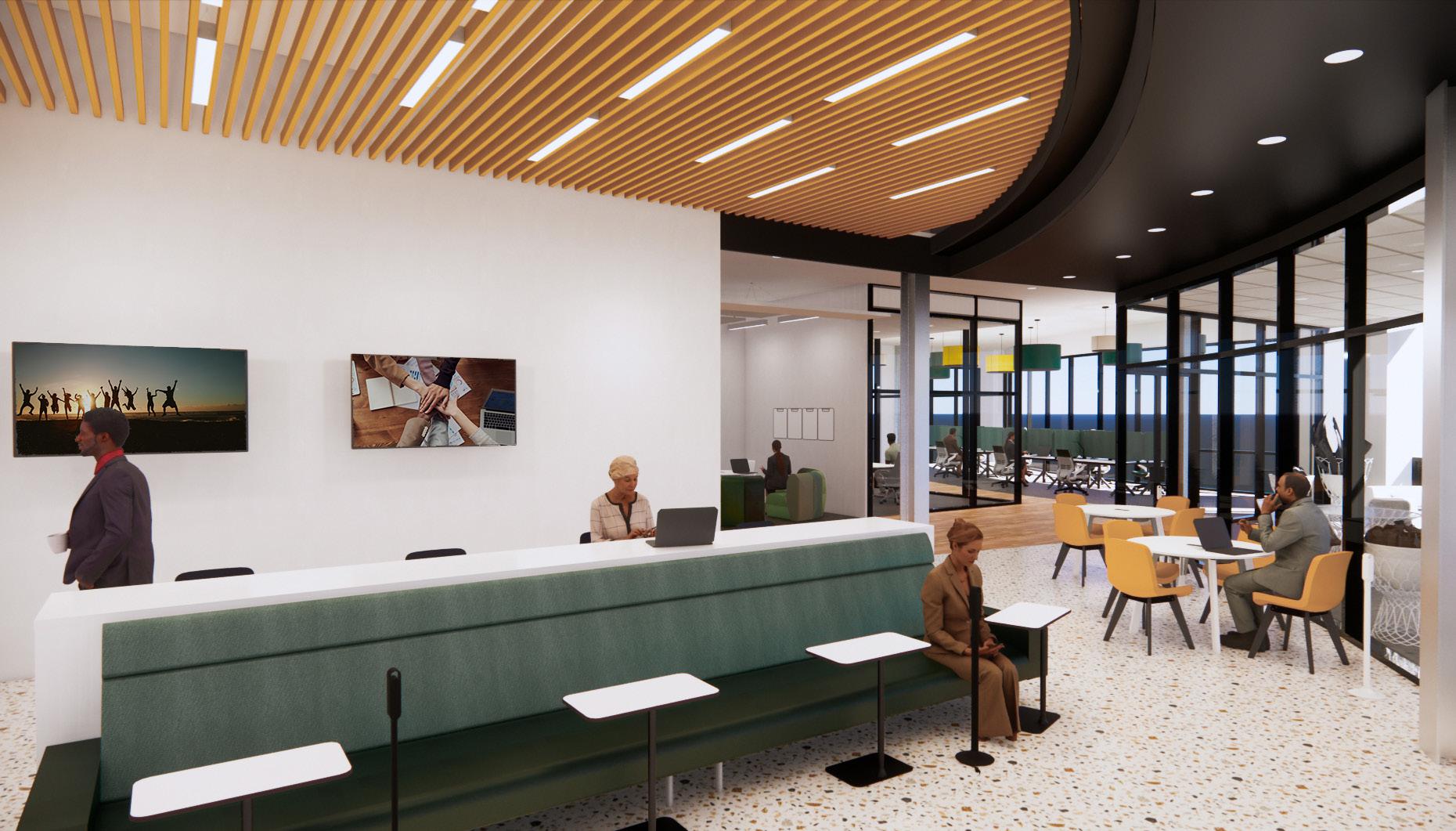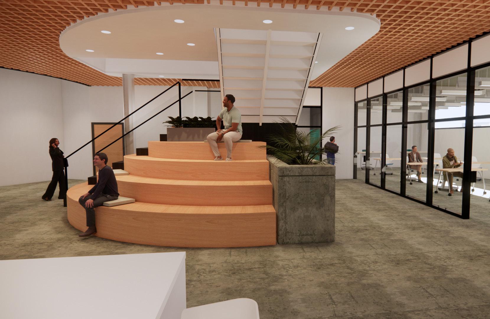 This monumental staircase was inspired by the unique shape of the building and also mirrors the design concept for the space. NEXT and their progressive, team based work culture can utilize these stairs to hold impromtu meetings, host individual work, or just serve as a unique visual in their space.