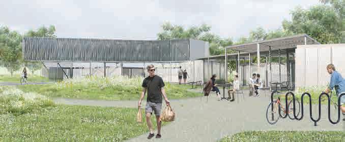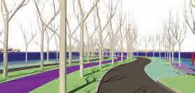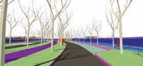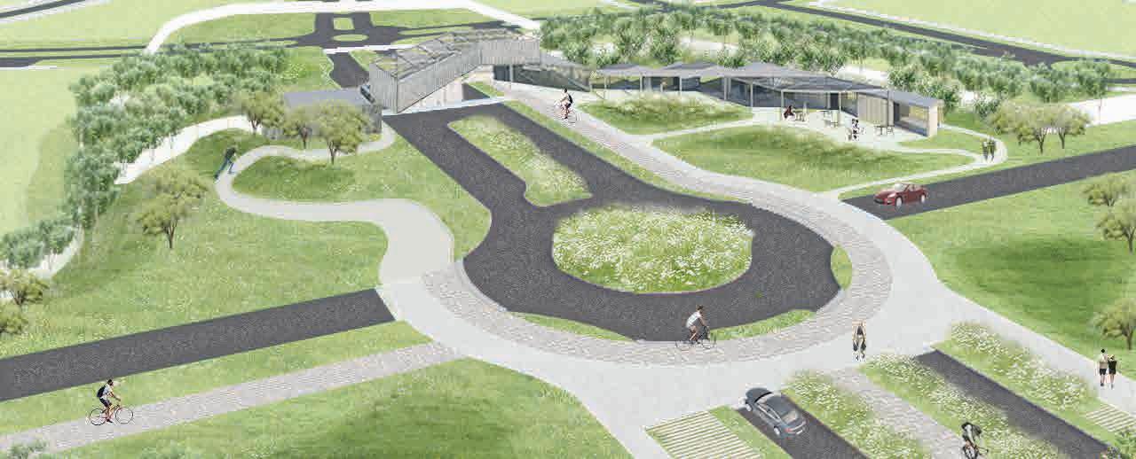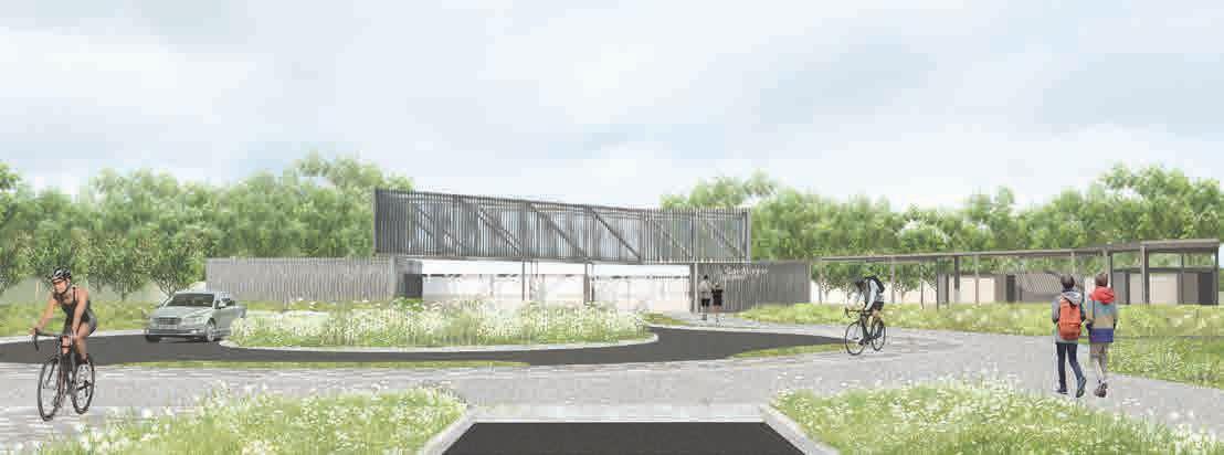 Propusimos un transcurrir onduleante, que invite a bajar de velocidad y sumergirse en la experiencia de este barrio. Un Boulevard con recorridos peatonales y ciclistas con fuerte presencia de vegetación e instancias de descanso, para ser no sólo un ingreso vial al barrio sino también un paseo que conecte al mismo con puntos de acceso a la ruta y el pueblo.