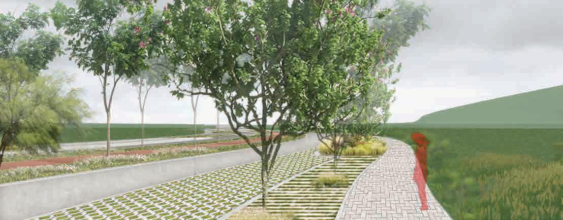 Esta estrategia está basada en la oprtunidad de desarrollar una vía de conexión entre la ruta y la entrada al barrio, como un recorrido de transición, como espacio de urbanidad en la ruralidad, como espacio de encuentro y socialización.