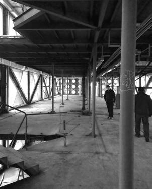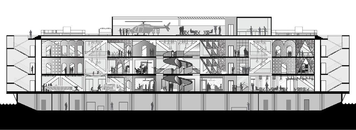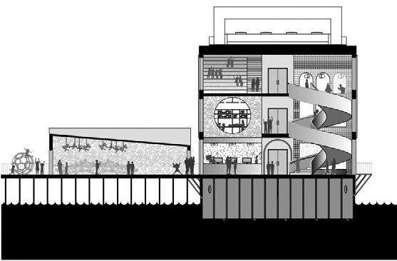 The building is an existing working barge that can change locations along the river. It is a three-story structure with a concrete load-bearing facade and steel constructions inside.