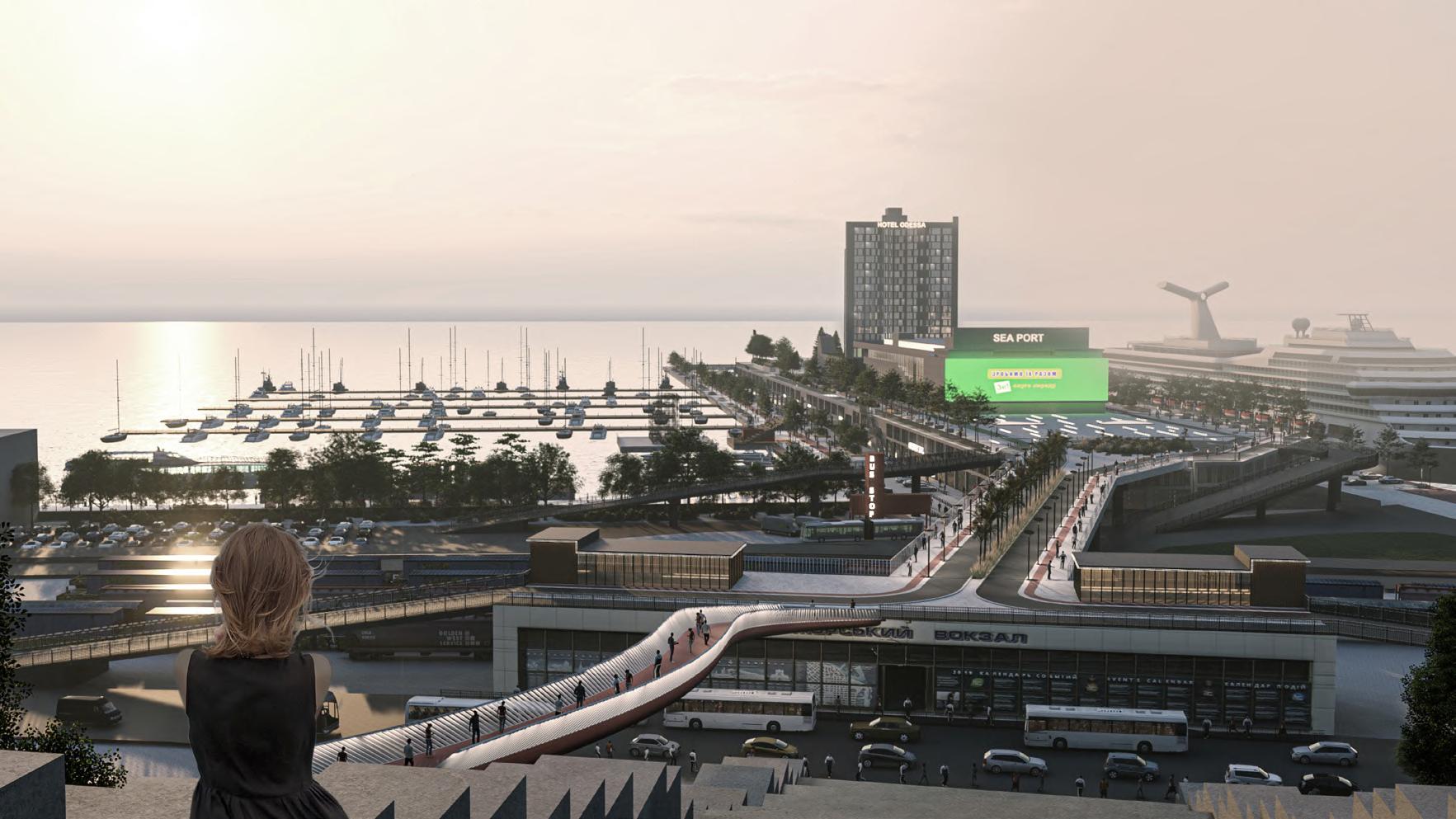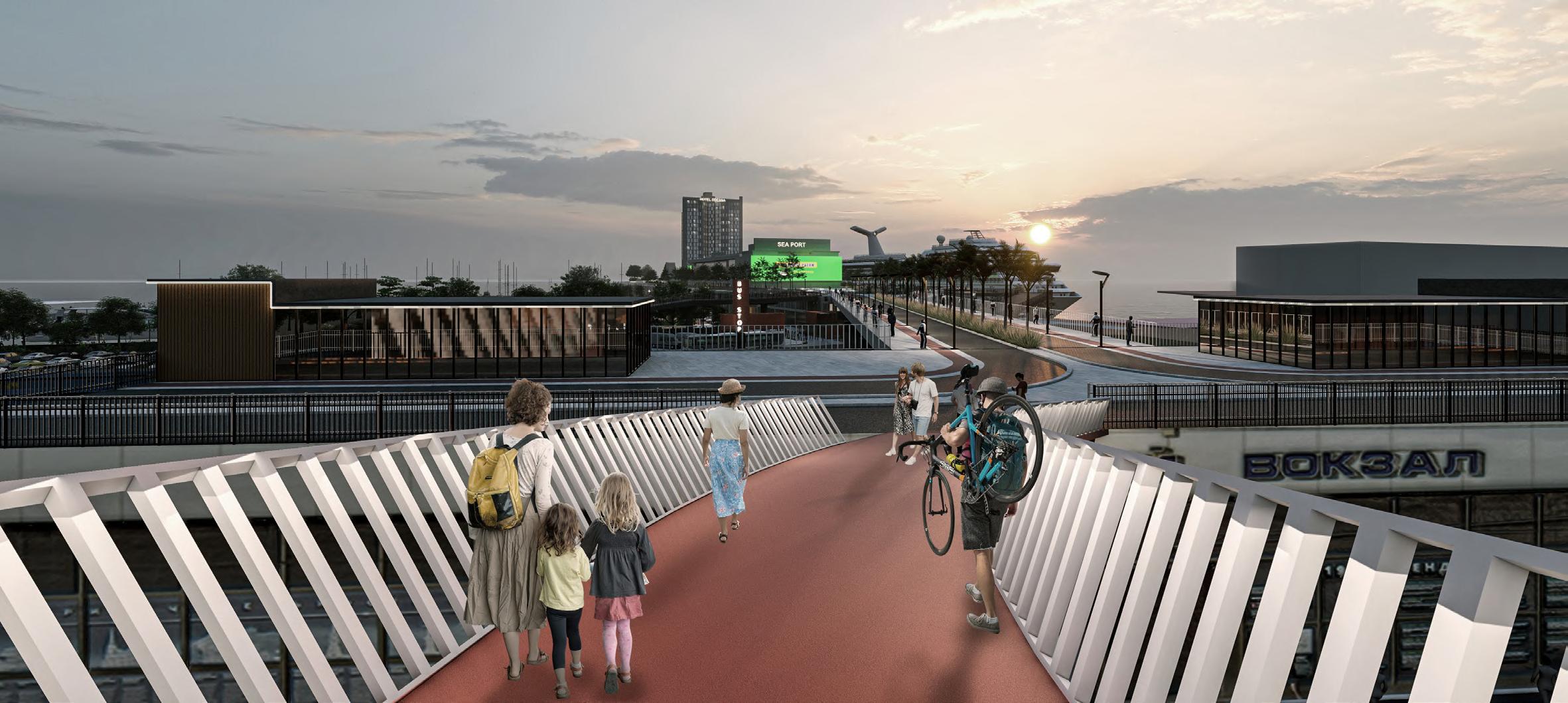 - Creation of a pedestrian bridge that will connect the pedestrian and walking part of the upper part of the city, the Potemkin stairs and the territory of the sea terminal, which are now torn apart by a hightraffic road