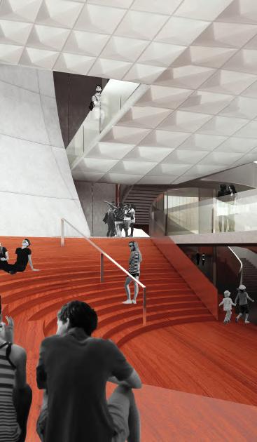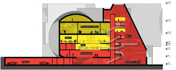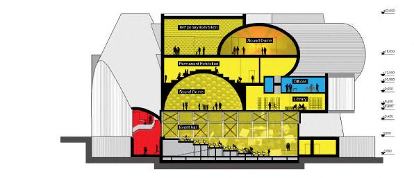 The future House of Hungarian Music will become a heart of the park, based on the crossroads of main movement directions and in a ring of four new museum buildings. We propose the idea of the building as architectural incarnation of synthesis of vision and hearing, metaphor of music as a complicated system of simple primitives, as a shell for sound experiments, multifunctional stage for learning Hungary Music in all it’s manifestations.