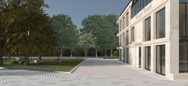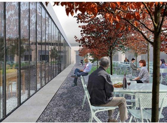 The primary architectural decision was to dismantle non-load-bearing walls within the former restaurant building, allowing natural daylight to flood the interior through large windows and accentuating the sensation of still being within the park. This park, with its mature tall trees, would serve as the interior’s focal point. Through the fullheight windows in the hotel, guests could feel as though they were immersed in nature. On the third floor, a glass-encased hall with lightweight metal structures opens onto a terrace, with the glass partition opening in the summer to merge the two spaces. Each hotel room provides access to a balcony, and on the second and fourth floors, there is access to a terrace. Stainless steel was used on the facade to reflect the surroundings and visually connect the structure to the park. The hotel’s facade features stone cladding for added aesthetic appeal.