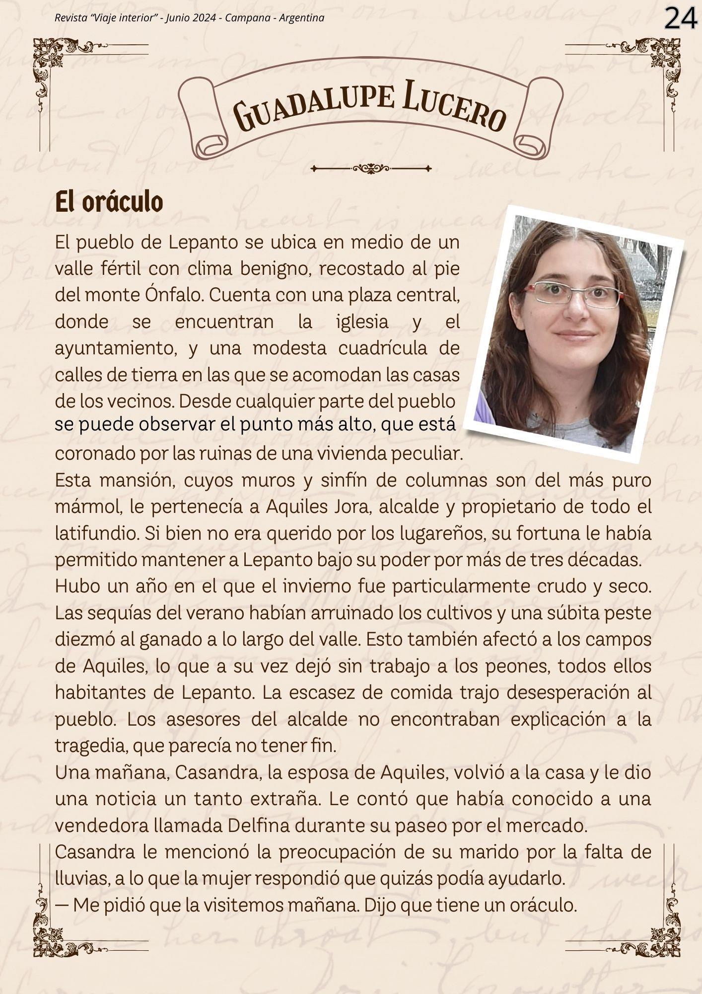 Viaje Interior es una publicación de distribución gratuita de Dilio Art Ediciones Revista mensual, junio de 2024 Número de reserva ante el Instituto Nacional del Derecho de Autor en trámite Todos los derechos reservados para Dilio Art Ediciones Prohibida su reproducción total o parcial, incluyendo cualquier medio electrónico para fines comerciales El editor se reserva el derecho de realizar corrección de estilo y ajustes pertinentes en la extensión de los artículos publicados. La revista Viaje Interior respeta el derecho a la libertad de expresión de los autores de los artículos publicados. El contenido de los artículos es responsabilidad de cada autor Las opiniones expresadas en los artículos reflejan únicamente el pensamiento de los autores Ciudad de Campana, provincia de Buenos Aires, República Argentina Año II – Número 2 –abril de 2024 dilioart2012@gmail com