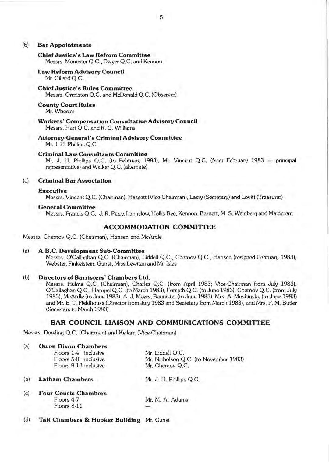 Messrs. P. D. Cummins Q.C. (Chairman) and M. B. Kellam (Bar Council members). Messrs. D. E. Curtain, M. B. Kellam, W_ E. Stuart, N. T. Robinson, Miss E. H. Curtain, Messrs. A. J. McDonald (Secretary), P. D. Elliott, Miss E. A. Kominos, Messrs. B. S. T. Vaughan and S. R. Marshall. Elections were held in August 1983.when the first five members retired but were eligible for re-election.
