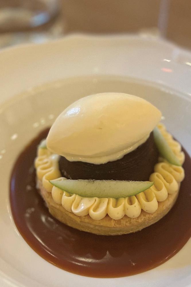 Australian oysters, well-seasoned beef tartare with smoked bone marrow, scallop gratin with caper and tarragon butter and a thoroughly satisfying plate of saucisson with radishes. We whisked through these dishes with a bottle of very fine Chablis before moving on to share a rib eye (O’Connor beef from Gippsland) with bearnaise sauce and a plate of Corner Inlet calamari in café de Paris butter. Here, Beaujolais from Morgon was our choice. Dessert too was shared; a dark chocolate, espresso and caramel tart, along with a type of deconstructed tarte tatin.