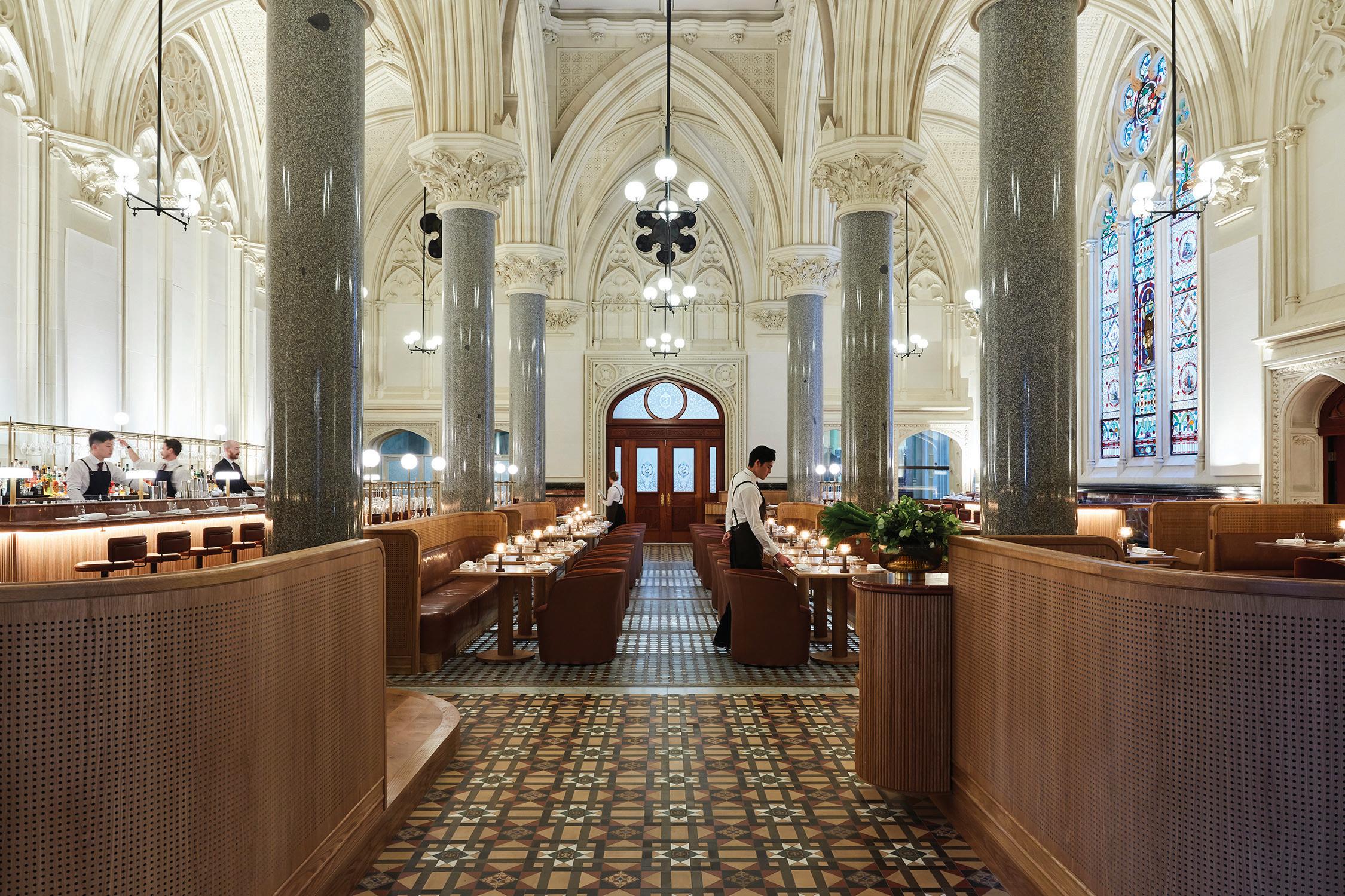 When you arrive at Reine & La Rue, a concierge greets you outside the restaurant. Momentarily, you wonder whether having a reservation will be enough to secure entry. Happily, we were admitted to the dining room, which is, to say the least, quite extraordinary. It has vast cathedral ceilings, a beautiful stained glass window and a colonnade. The people-watching fits the scene, a mixture of businessy-types and the sort of people who don’t look like they work (but could recommend a surgeon for certain elective procedures).