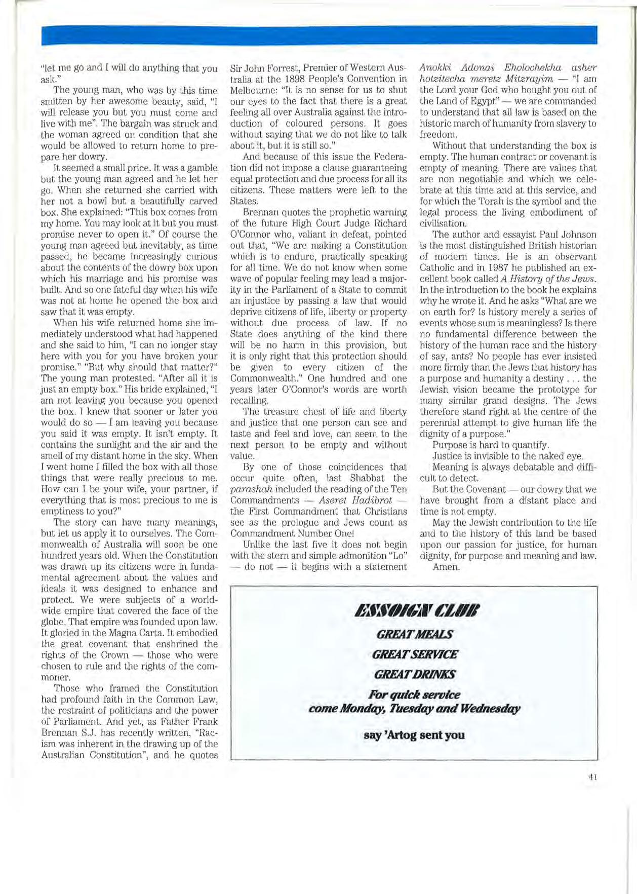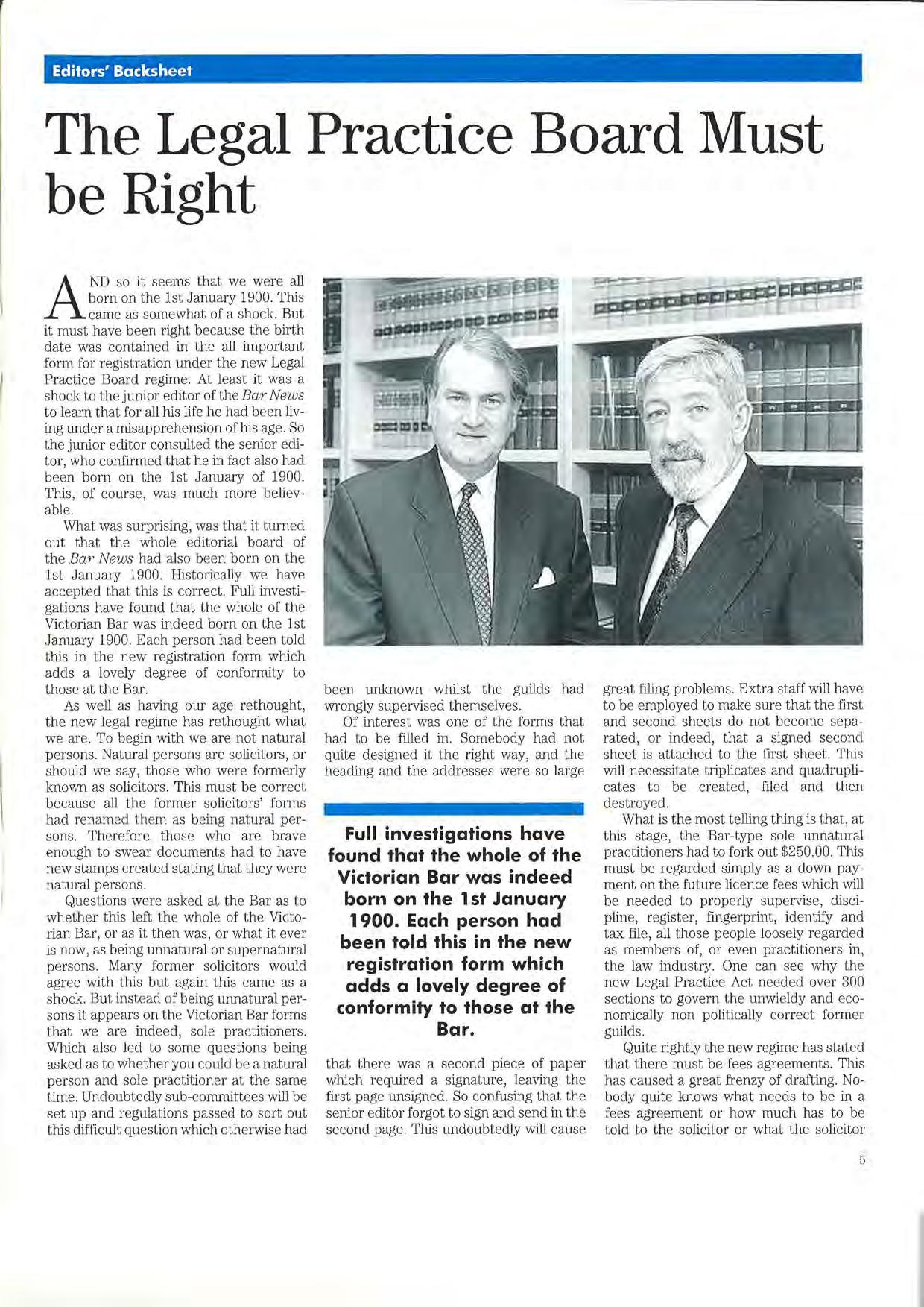 AND so it seems that we were all born on the 1st January 1900. This came as somewhat of a shock. But it must have been right because the birth date was contained in the all important form for registration under the new Legal Practice Board regime. At least it was a shock to the junior editor of the Bar News to learn that for all his life he had been living under a misapprehension of his age. So the junior editor consulted the senior editor, who confirmed that he in fact also had been born on the 1st January of 1900. This, of course, was much more believable.