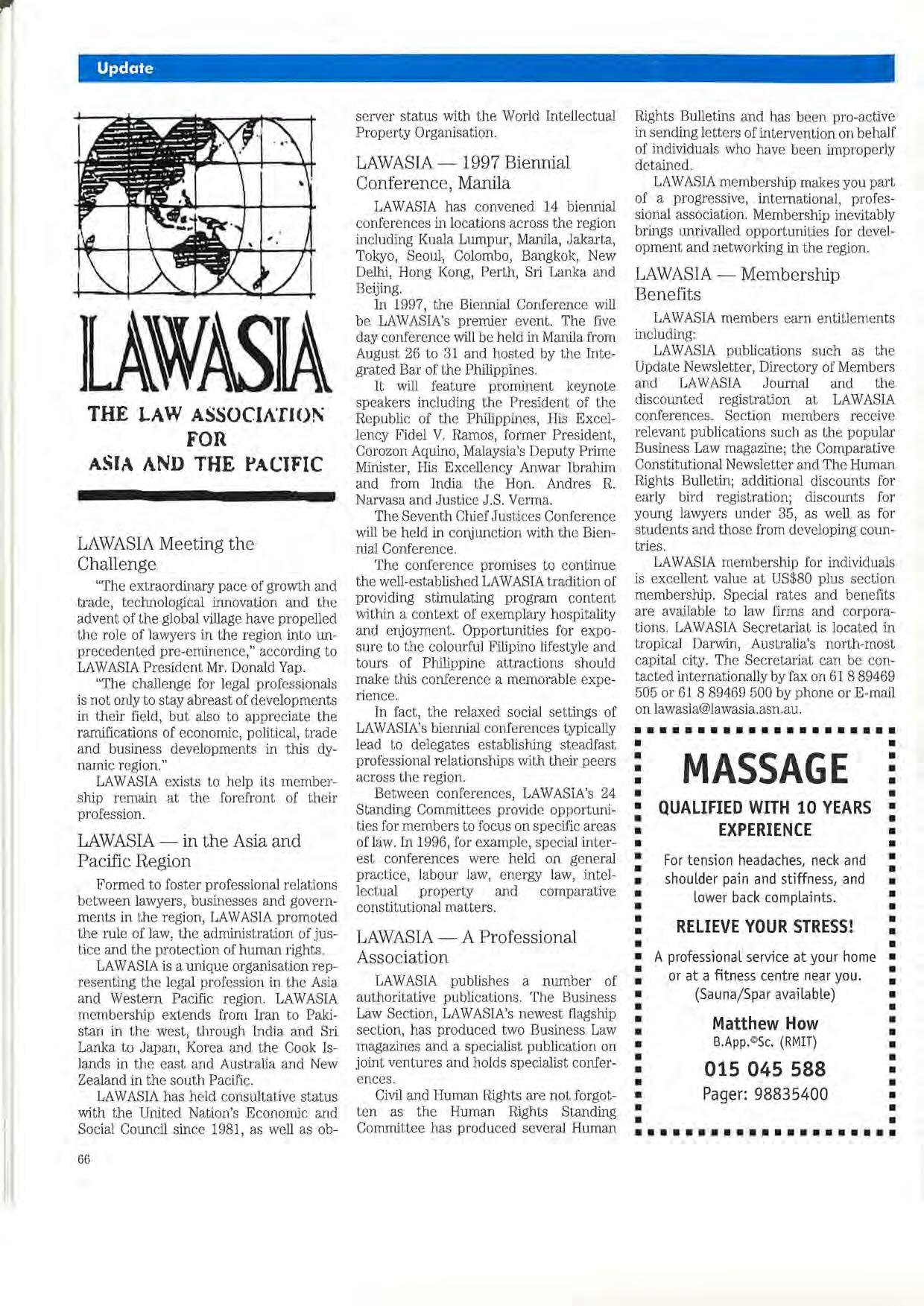 LAWASIA publications such as the Update Newsletter, Directory of Members and LAWASIA Journal and the discounted registration at LAWASIA conferences. Section members receive relevant publications such as the popular Business Law magazine; the Comparative Constitutional Newsletter and The Human Rights Bulletin; additional discounts for early bird registration; discounts for young lawyers under 35, as well as for students and those from developing countries.