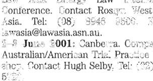 Australian Institute of Criminology, E-mail: julie.dixon@aic.gov.au. Tel: (02) 6280 9229. 12-19 August 2001: Thredb o, NSW. The Australasian Legal Conferen ce 20-26 S e ptember 2001 : [Wme, Italy, Pan Europe Asia Legal Confe r e nce. 2 1-23 Se pt e mb e r 2001 : Hobar t. 19th AIJi\ Annual Conference. Cont a ct AIJA website.