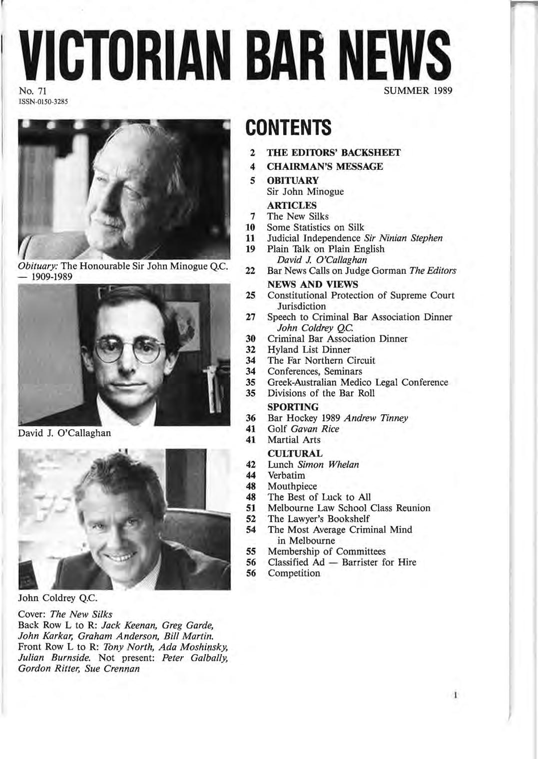 SIR JOHN MINOGUE WAS THE MOST likeable of men, learned, gracious and urbane. He died on the 19th September 1989. A few days before his death, in typical Minogue fashion and quite undeterred by the knowledge that he was dying, he celebrated his 80th birthday, surrounded by old friends, many of whom had been his contemporaries at the Victorian Bar.