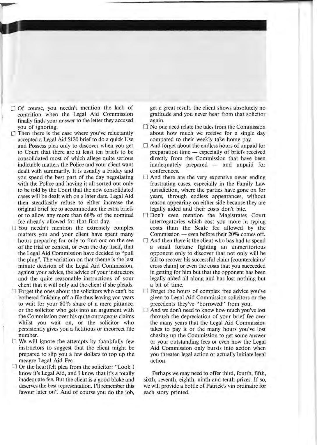 o And we don't need to know how much you've lost through the depreciation of your brief fee over the many years that the Legal Aid Commission takes to pay it or the many hours you've lost chasing up the Commission to get some answer or your outstanding fees or even how the Legal Aid Commission only bursts into action when you threaten legal action or actually initiate legal action.