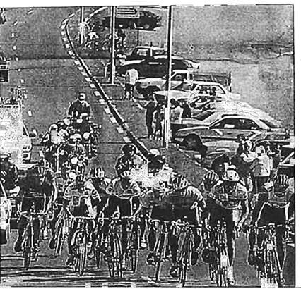 Sean Hanly avec Emmanuel Pillet dans sa roue, daM Is mont" de Is cote Blanche Lo(squ'on a vu tOt Ie tie facile lors de cette secallmatin les drapeaux des de €ltape sur huit sponsors "tendus comme grands circuits de l'Anseune ligne i\ sur Ie front Vata Et de fait, Ie vent a beau coup contrarie la progression des coureurs des la