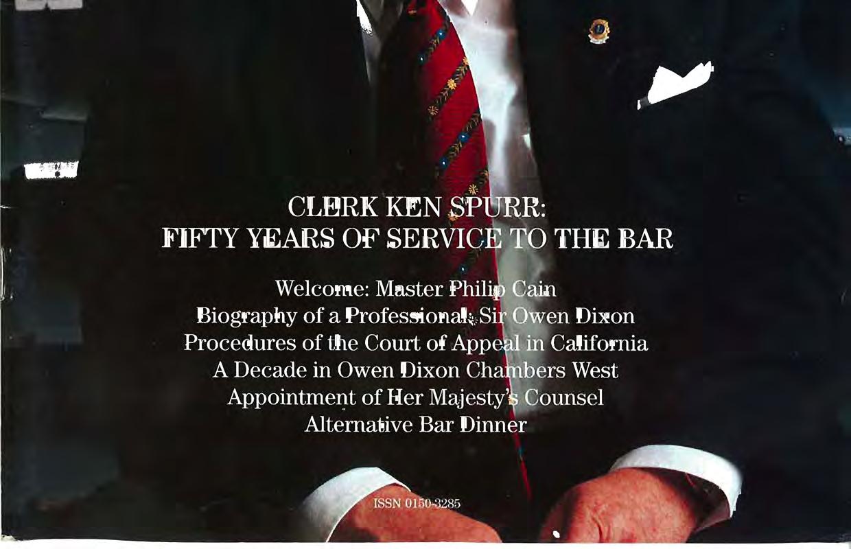 Cover. On page 17, we feature an interview by Bill Martin Q C and Nicola Hoobin with Clerk Ken Spurr on the eve oj his retirement after 50 years' service to the Victorian Bar.