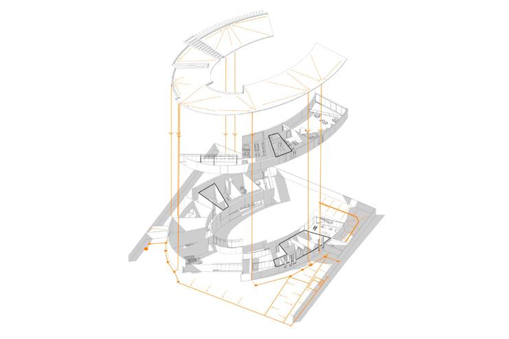 The project’s first two levels consist of double-height industrial warehouses with mezzanines, and on the upper levels, there is a hostel, coworking areas, and apartments of various typologies that adapt to the specific needs of the users.
