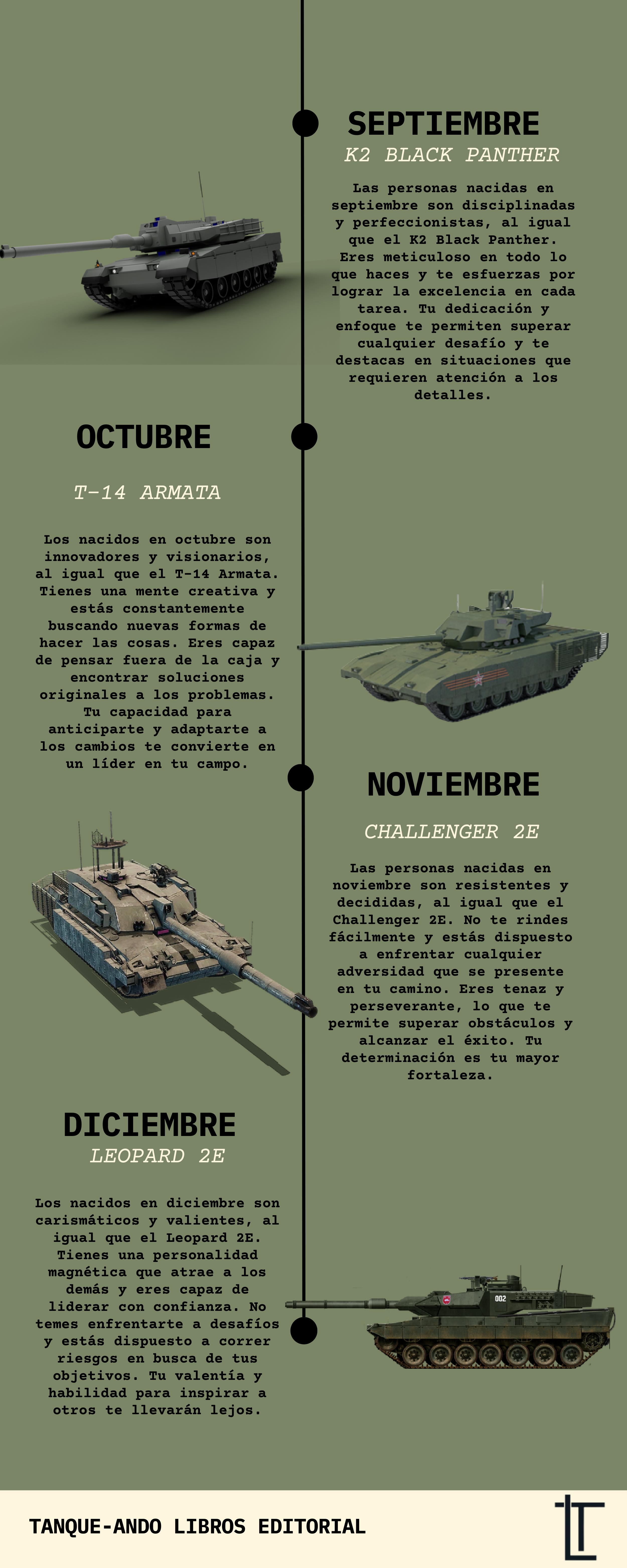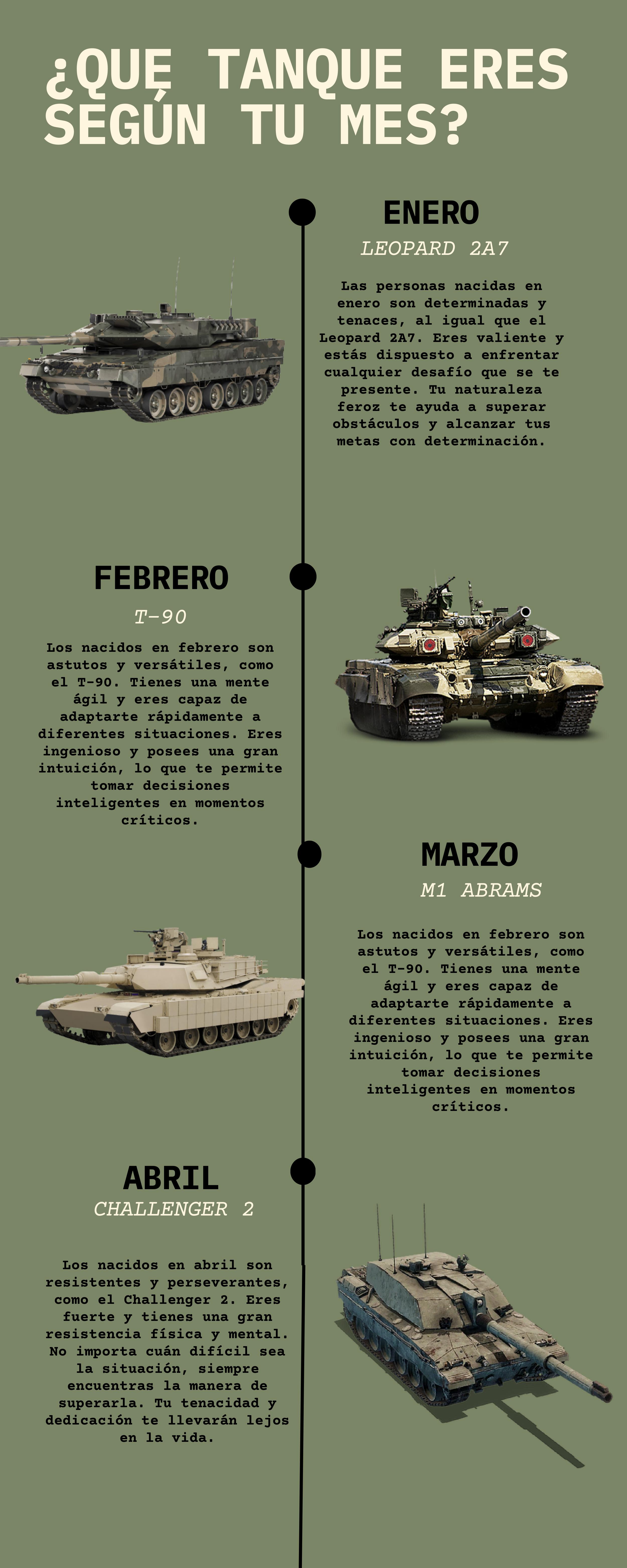 Eres un tanque que se adapta a las situaciones. Este mes te esperan muchas batallas en el campo. Aprovecha tu pensamiento rápido para encontrar soluciones innovadoras, y derrotar a tus adversarios.