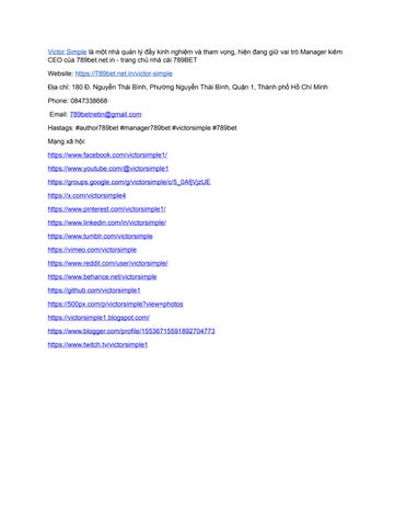 Victor Simple là một nhà quản lý đầy kinh nghiệm và tham vọng, hiện đang giữ vai trò Manager kiêm CEO của 789bet.net.in - trang chủ nhà cái 789BET Website: https://789bet.net.in/victor-simple Địa chỉ: 180 Đ. Nguyễn Thái Bình, Phường Nguyễn Thái Bình, Quận 1, Thành phố Hồ Chí Minh Phone: 0847338668 Email: 789betnetin@gmail.com Hastags: #author789bet #manager789bet #victorsimple #789bet