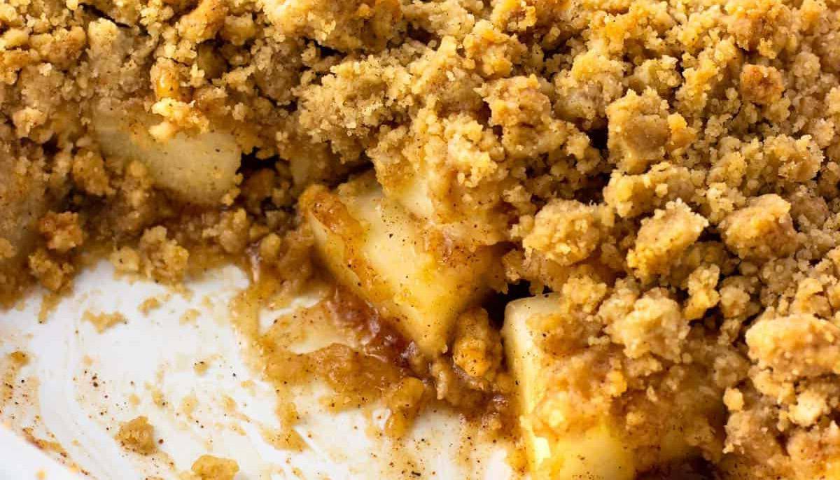 8. Serve the pear crumble warm, with a scoop of vanilla ice cream or custard if desired.