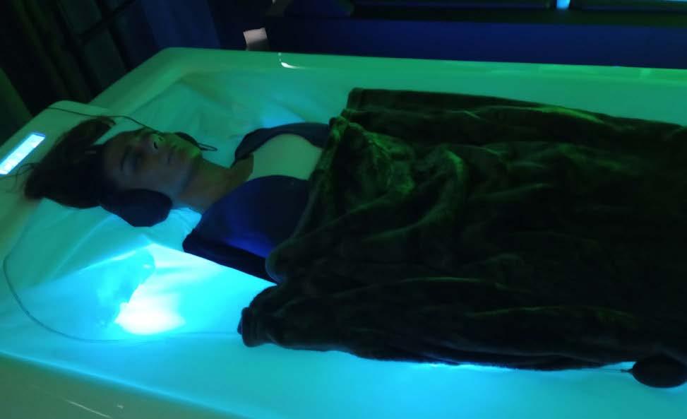 Probando Zestós DryFloat de Gharieni en Düsseldorf. Sensación de gravedad cero y masaje con chorros de agua.