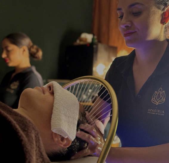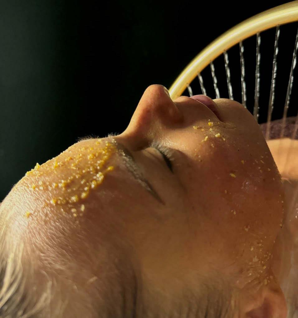 Tras el lavado de la cabeza, se aplica una mascarilla de romero y caléndula que fortalece el cabello. El aroma de aceites especiales y las hierbas de la mascarilla también ayudan a exfoliar las células muertas del cuero cabelludo, dejándolo limpio y revitalizado.