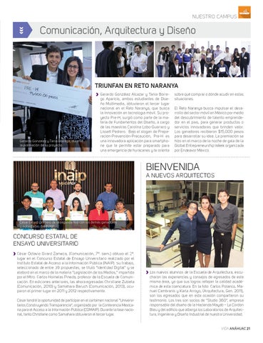 CONCURSO ESTATAL DE ENSAYO UNIVERSITARIO César Octavio Girard Zameza, (Comunicación, 7º. Sem.) obtuvo el 2º. lugar en el Concurso Estatal de Ensayo Universitario realizado por el Instituto Estatal de Acceso a la Información Pública (INAIP). Su trabajo, seleccionado de entre 39 propuestas, se tituló “Identidad Digital” y se elaboró en el marco de la materia “Legislación de los Medios,” impartida por el Mtro. Carlos Hornelas Pineda, profesor de la Escuela de Comunicación. En ediciones anteriores, las ahora egresadas Christiane Zubieta (Comunicación, 2010) y Samahara Baruch (Comunicación, 2013), ocuparon el primer lugar en 2011 y 2012 respectivamente. César tendrá la oportunidad de participar en el certamen nacional “Universitarios Construyendo Transparencia”, organizado por la Conferencia Mexicana para el Acceso a la Información Pública (COMAIP). Durante la fase nacional, tanto Christiane como Samahara obtuvieron el tercer lugar.