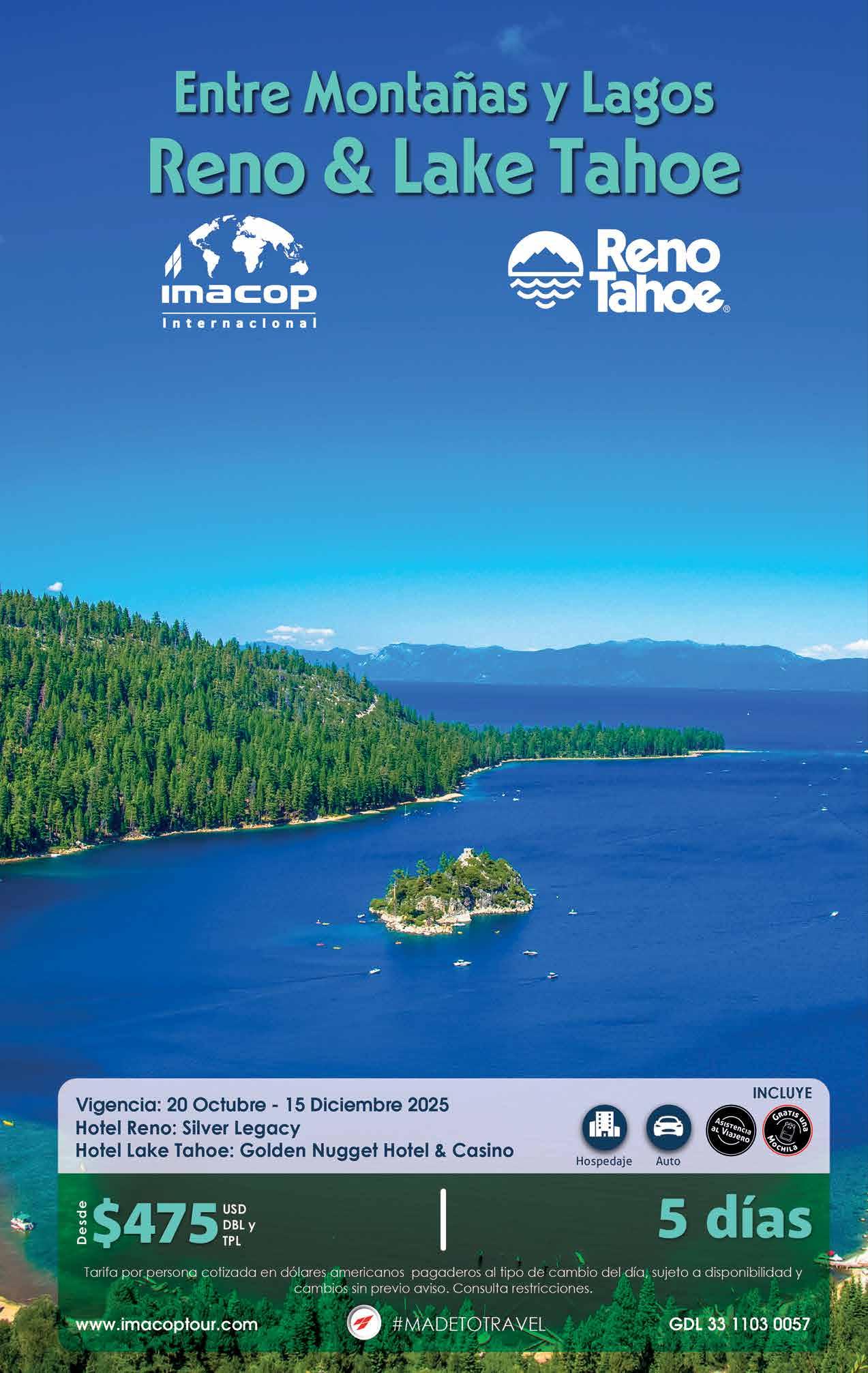 • Tours fuera de lo común por la ciudad, vida nocturna y conciertos de altura, así como paseos para disfrutar de las vistas que regala Lake Tahoe, son la dualidad perfecta en Reno Tahoe