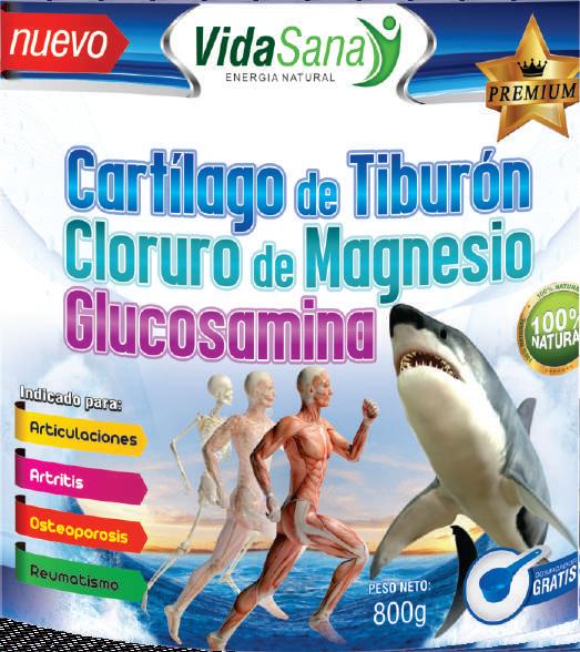 Colágeno hidrolizado, Cartílago de Tiburón, Cloruro de Magnesio, Glucosamina, Cloruro de Magnesio, Sulfato de Condroitina, Algas marinas, Fósforo, Hierro, Zinc , Vitamina D y B12.