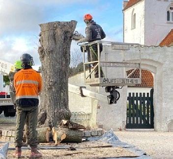 ter gik man i gang med selve stammen, der også blev skåret i skiver, trukket over på liften og derfra trukket over på lastbilen. Nogle af stykkerne landede på jorden med et brag, og blev så løftet op i lastbilen. Det var en fascinerende proces. Kirkeværge Birthe Bjerge er yderst tilfreds med udførelsen af arbejdet. »Hvor er det rart, at det er ordentligt arbejde - jeg fik helt kuldegysninger. Og så får vi det rodfræset i løbet af ugen.« Menighedsrådet har besluttet at lave et bed på den runde plads, der er omgærdet af store sten. I 2021 fik menighedsrådet plantet et nyt lindetræ ved indkørslen til kirkens P-plads, hvor det står med god afstand til den gamle kirkemur og -portal. Forhåbentlig vil det vokse op, så man også fremover vil blive mødt af et flot lindetræ, når man kommer til Fløng Kirke.
