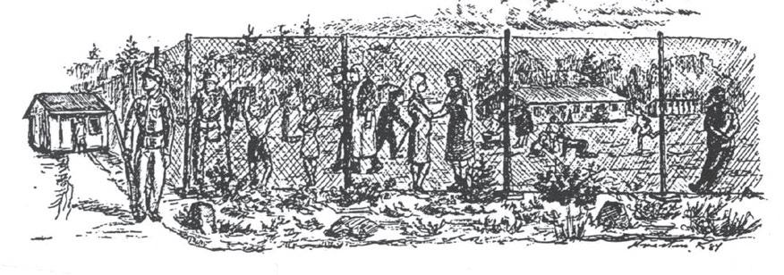Stregtegning af flygtningelejren ved Lyngs, hvor der døde seks børn under et år og otte ældre personer, før lejren blev sløjfet i maj 1946.
