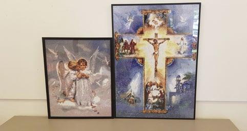 Billederne er lavet med en særlig teknik, hvor små perler bliver limet på en større flade. Læg mærke til de flotte motiver, som Lotte har valgt til os.